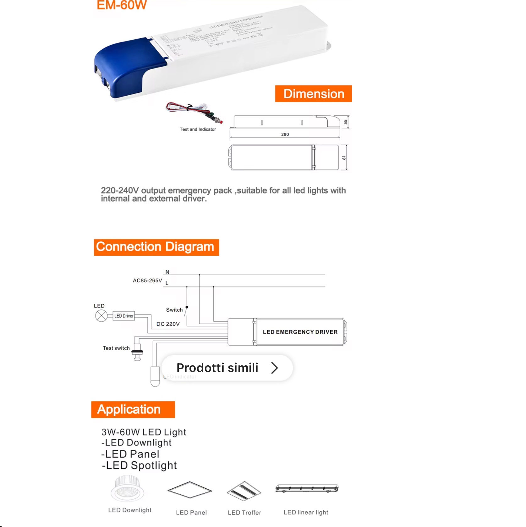 Driver di Emergenza Universale per Lampade LED da 3W a 60W, Autonomia fino a 300 Minuti, Compatibile con Tubi LED, Alimentazione 220V, Kit di Emergenza Affidabile