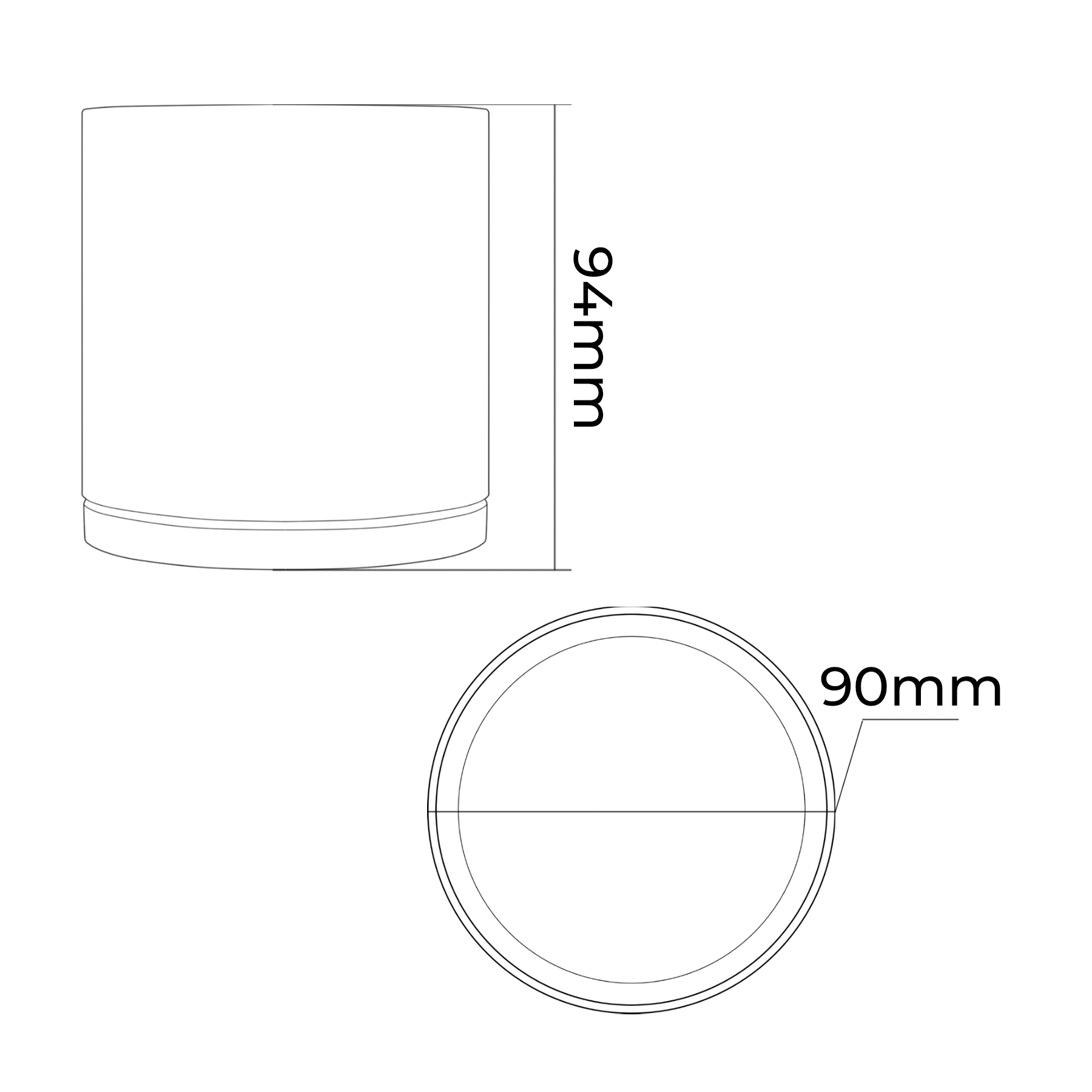 Infografica Dimensioni 94x90mm Faretto Cilindrico Bianco per Lampadine GU10Faretto Cilindrico con Attacco GU10 Installato a Soffitto Acceso Luce Calda