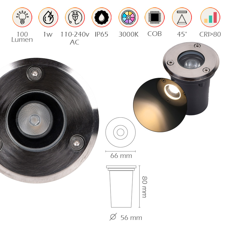 Il faretto LED segnapasso calpestabile da 1W luce calda 3000K è una soluzione d’illuminazione esterna altamente versatile, progettata per combinare efficienza energetica, durata e un'estetica raffinata. Grazie alla sua luce calda, crea un’atmosfera accogliente e piacevole, ideale per valorizzare viali, vialetti, camminamenti, ingressi di negozi e aree verdi come giardini. Realizzato con materiali di alta qualità come l’acciaio inox e il vetro temperato, questo faretto è progettato per resistere all’usura del tempo e agli agenti atmosferici, assicurando una lunga vita operativa. Il grado di protezione IP65 garantisce resistenza a polvere e spruzzi d’acqua, rendendolo perfetto per ambienti esterni soggetti a condizioni climatiche variabili. Il LED COB (Chip On Board) integrato fornisce un’efficienza luminosa eccellente, con un output di 100 lumen per watt, consentendo di ottenere una luce calda e omogenea con un consumo energetico minimo. Questo lo rende un dispositivo ecologico e rispettoso dell’ambiente, classificato con una classe energetica A+. Grazie al suo angolo di illuminazione di 45°, il faretto offre una distribuzione luminosa mirata, perfetta per evidenziare percorsi pedonali, ingressi o elementi decorativi del giardino. La luce calda a 3000K è ideale per creare un ambiente intimo e rilassante, aumentando il comfort visivo e migliorando l'estetica complessiva degli spazi. L'installazione è semplice e immediata: la tensione di alimentazione AC 85-265V consente di collegare direttamente il faretto alla rete elettrica domestica senza la necessità di un alimentatore aggiuntivo. Le dimensioni compatte (80 x 66 mm) e il foro di incasso di 56 mm ne facilitano l’integrazione su varie superfici, garantendo un risultato discreto ed elegante. Oltre alla robustezza e alla facilità d'uso, il faretto LED si distingue per la sua resa cromatica con un indice CRI superiore a 80, che garantisce colori naturali e vividi, migliorando l'estetica degli spazi illuminati. Con una vita media di circa 25.000 ore, rappresenta un investimento duraturo e conveniente per privati e professionisti. Che si tratti di illuminare il vialetto di casa o di aggiungere un tocco di eleganza a uno spazio commerciale, questo faretto LED segnapasso è la scelta ideale per un'illuminazione esterna efficace, sostenibile e dal design moderno. Rendi più confortevoli e sicuri i tuoi spazi esterni con questo faretto LED segnapasso calpestabile, progettato per offrire prestazioni di lunga durata e un design elegante