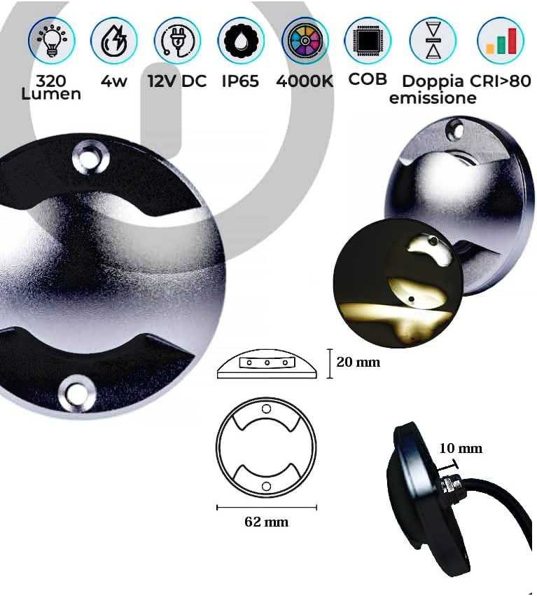 Il faretto segnapassi LED 4W calpestabile è una soluzione innovativa e funzionale per l'illuminazione esterna. Progettato con una luce radente a doppia emissione, è ideale per illuminare con stile ed efficienza viali, giardini, percorsi pedonali, terrazzi, pedane e altri spazi esterni. Grazie al design compatto e moderno, con una forma tonda e una finitura in alluminio color Nero, questo faretto garantisce resistenza, estetica e versatilità in ogni contesto di installazione. Dotato di LED integrati COB, il faretto offre una luminosità pari a 320 lumen, distribuiti uniformemente grazie a un angolo di illuminazione di 45°. Con una temperatura di colore di luce naturale a 4000K, si crea un'atmosfera piacevole e ben bilanciata, perfetta per guidare in sicurezza i passi lungo percorsi bui o per enfatizzare elementi architettonici o decorativi. La classe energetica A+ e il consumo ridotto di soli 4W assicurano un'illuminazione sostenibile e a basso impatto sui costi energetici. Progettato per essere calpestabile, questo faretto è ideale per installazioni a livello del suolo su superfici piane come cemento o pavimenti. Non necessita di incasso né di controcassa, rendendo l'installazione rapida e semplice grazie agli appositi fori per il fissaggio. Il grado di protezione IP65 garantisce una resistenza eccellente contro polvere, pioggia e altre intemperie, assicurando una lunga durata anche in condizioni climatiche avverse. Con una vita utile stimata di 25.000 ore, rappresenta una scelta durevole e affidabile per progetti di illuminazione esterna. Questo prodotto funziona a una tensione di 12V (alimentatore non incluso), rendendolo compatibile con sistemi di alimentazione a bassa tensione, tipici degli impianti di illuminazione da esterno. Le sue dimensioni compatte, pari a 62 x 62 x 35 mm, lo rendono discreto ma efficace, integrandosi perfettamente in qualsiasi contesto architettonico. Perfetto per illuminare e valorizzare giardini, viali, terrazzi, pedane, bordi piscina e camminamenti, il faretto segnapassi LED è la soluzione ideale per chi cerca un prodotto efficiente, robusto e dal design curato. Il suo grado di resa cromatica (CRI >80) assicura colori vividi e naturali, migliorando ulteriormente l’esperienza visiva. Scegliendo questo faretto segnapassi, otterrai un’illuminazione elegante, pratica e sicura per i tuoi spazi esterni, garantendo al tempo stesso risparmio energetico e una durata superiore rispetto alle tradizionali soluzioni di illuminazione. Con il faretto segnapassi LED 4W, puoi combinare efficienza, design e funzionalità, illuminando in modo impeccabile ogni ambiente esterno