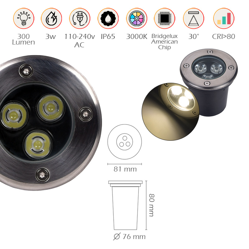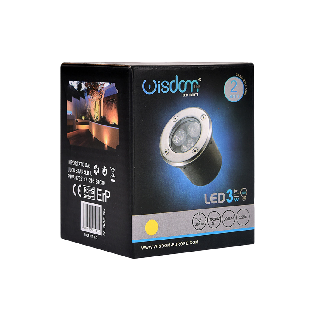 Il faretto segnapasso a LED calpestabile da giardino è la soluzione perfetta per illuminare con stile e funzionalità vialetti, camminamenti, stradine, ingressi e giardini. Con una potenza di 3W e una luce calda da 3000K, questo dispositivo garantisce un'atmosfera accogliente e raffinata in ogni spazio esterno. Realizzato in acciaio inox e vetro temperato, è progettato per resistere alle condizioni climatiche più avverse, grazie al suo grado di protezione IP65, che lo rende ideale per ambienti esterni. Il chip LED integrato Bridgelux American garantisce un'elevata efficienza energetica con una resa luminosa di 100 lm/W, offrendo una luminosità di 300 lumen. La sua classe energetica A+ assicura consumi ridotti, rendendolo una scelta ecologica e conveniente. Con un angolo di illuminazione di 45°, questo faretto è pensato per direzionare la luce in modo efficace, valorizzando percorsi pedonali, ingressi di negozi o qualsiasi altra area esterna. La tensione di alimentazione a 220V consente un'installazione facile e diretta senza la necessità di un alimentatore esterno. Questo segnapasso ha una durata stimata di 25.000 ore, assicurando una lunga vita utile senza necessità di manutenzione frequente. Le dimensioni compatte (81 x 80 mm) e il foro di incasso standard (76 mm) lo rendono compatibile con la maggior parte delle installazioni. Le sue caratteristiche tecniche includono un indice di resa cromatica (CRI) >80 per colori naturali e realistici, una temperatura di colore di 3000K per un'illuminazione calda e accogliente, e una struttura robusta in acciaio inox combinata con vetro temperato per garantire massima sicurezza e durabilità. Perfetto per chi cerca una soluzione di illuminazione elegante, resistente e performante, il faretto LED calpestabile si integra armoniosamente in ogni contesto architettonico esterno