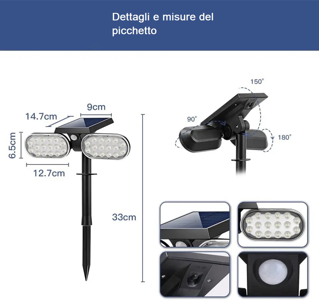 Faro Faretto 32 Led Da Giardino con picchetto e Pannello Solare Crepuscolare 60w Luce Bianca fredda 6500K