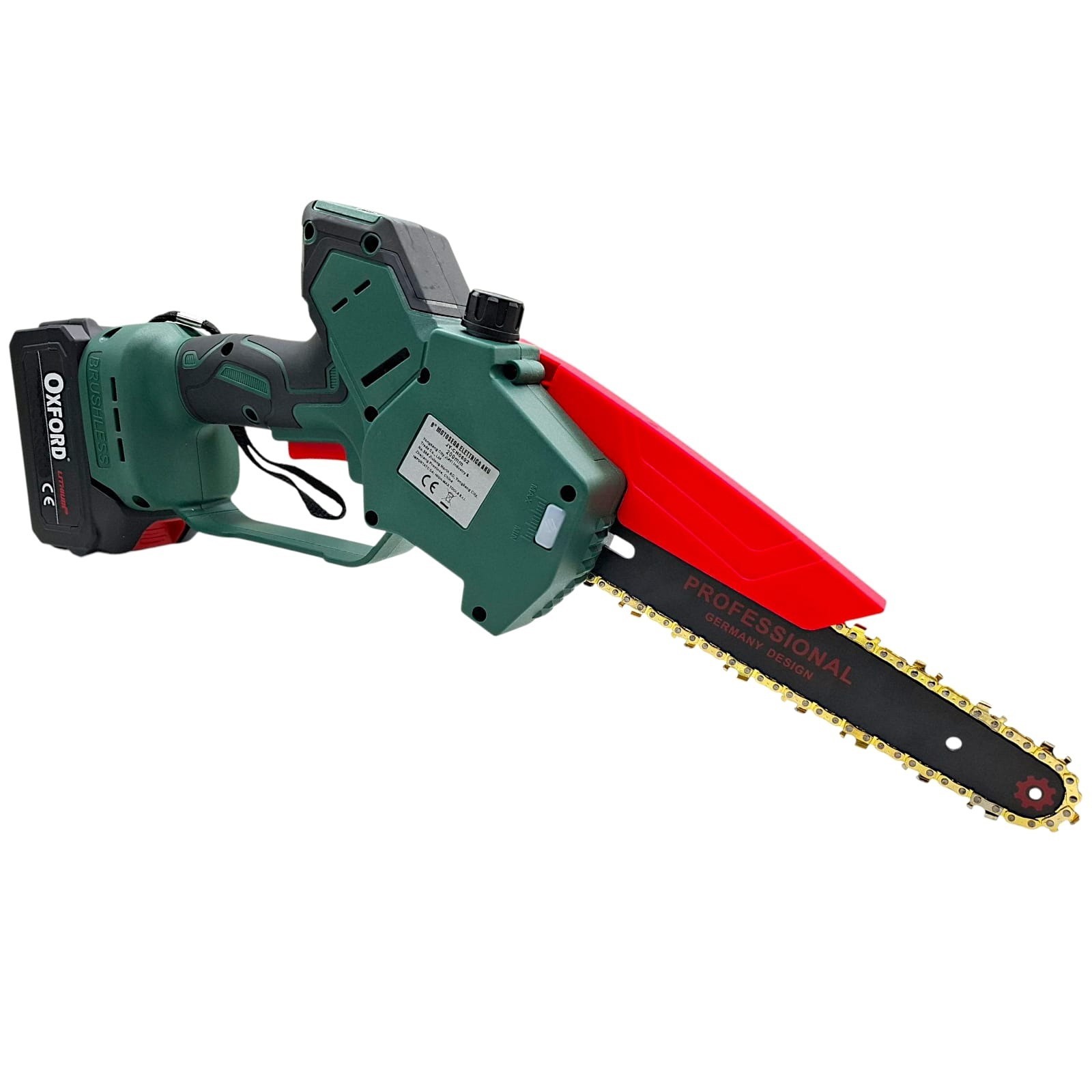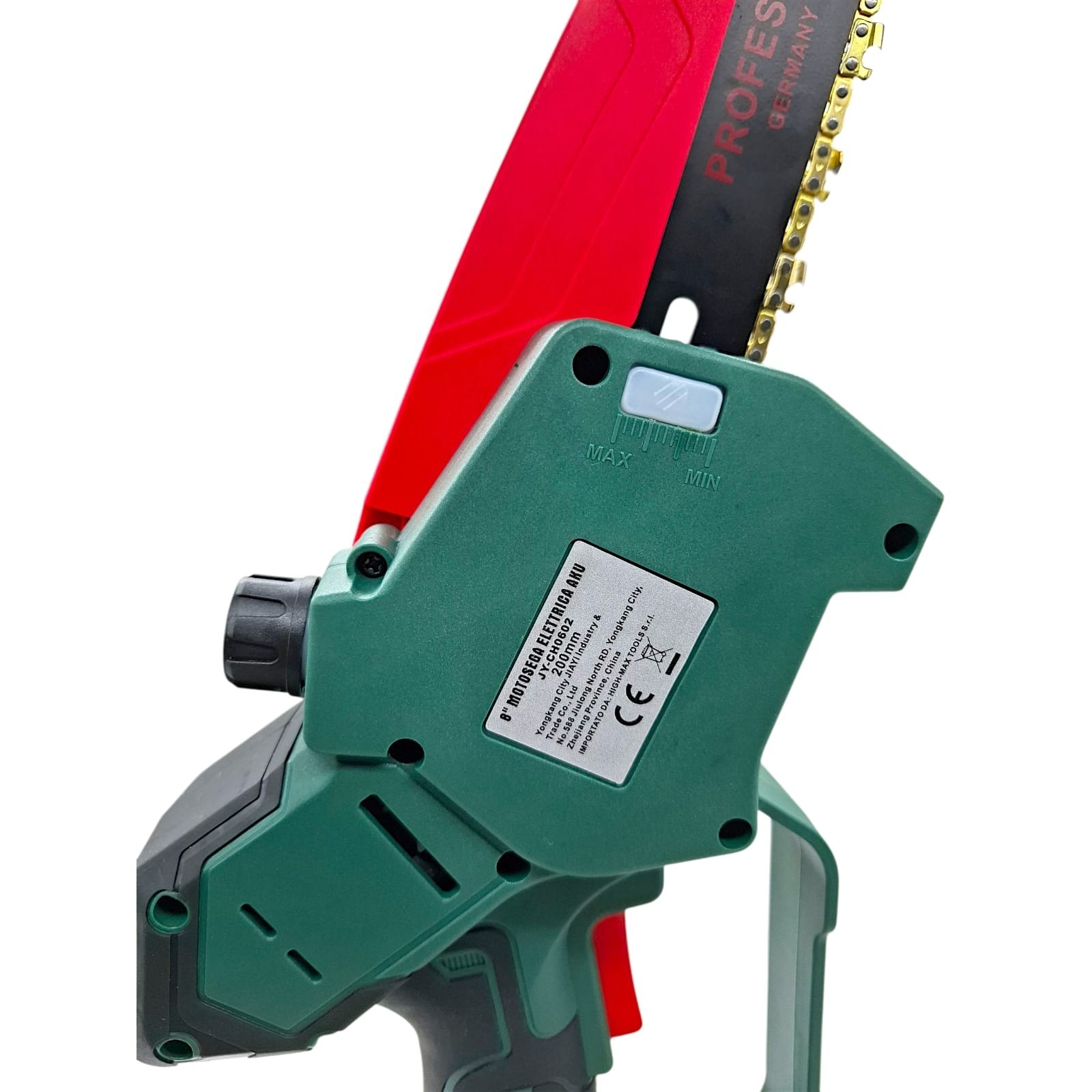 La motosega è dotata di sistema di auto lubrificazione, motore brushless ad alta efficienza, pulsante di sicurezza e lama da 8" con barra aggiuntiva da 6" di ricambio.