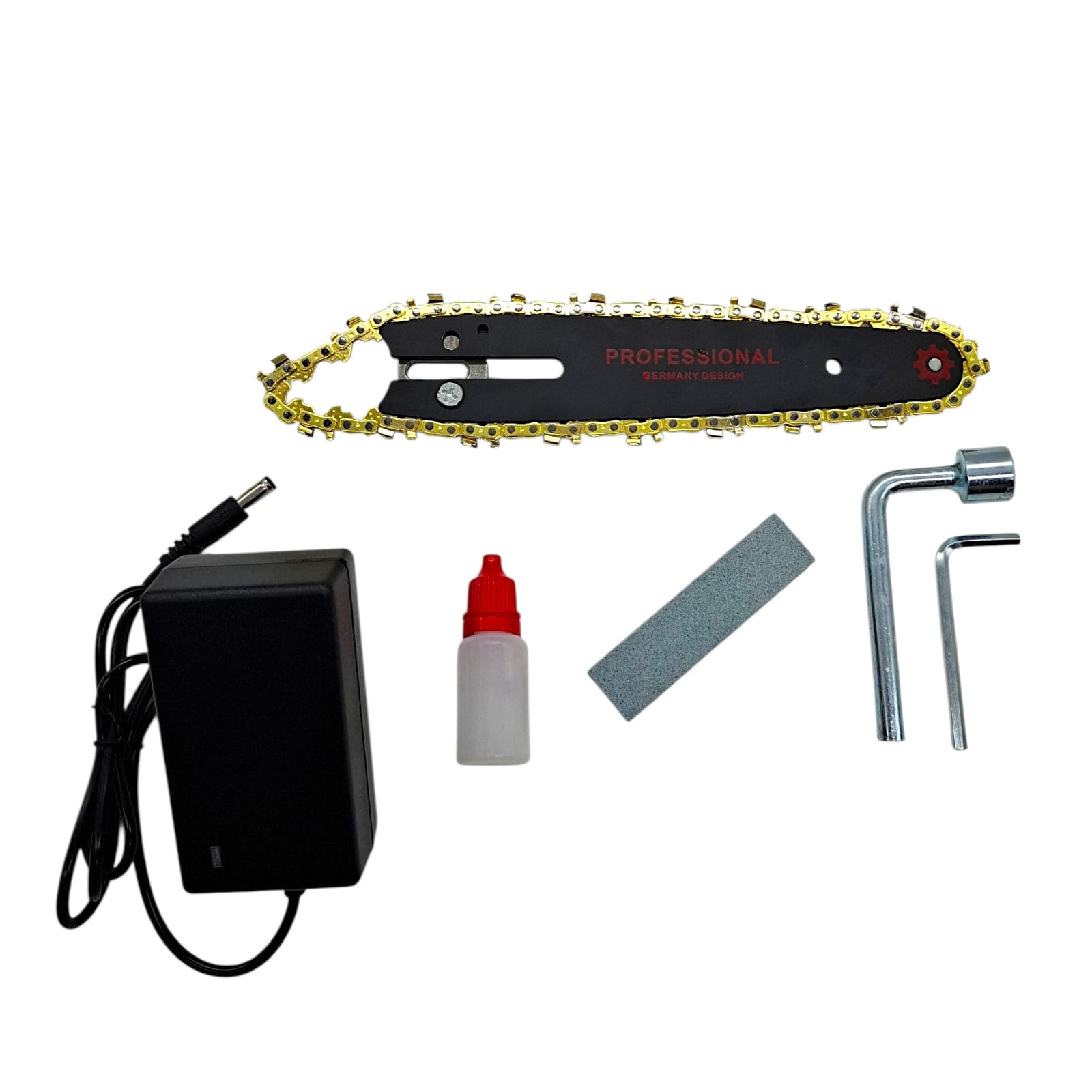 La motosega è dotata di sistema di auto lubrificazione, motore brushless ad alta efficienza, pulsante di sicurezza e lama da 8" con barra aggiuntiva da 6" di ricambio.