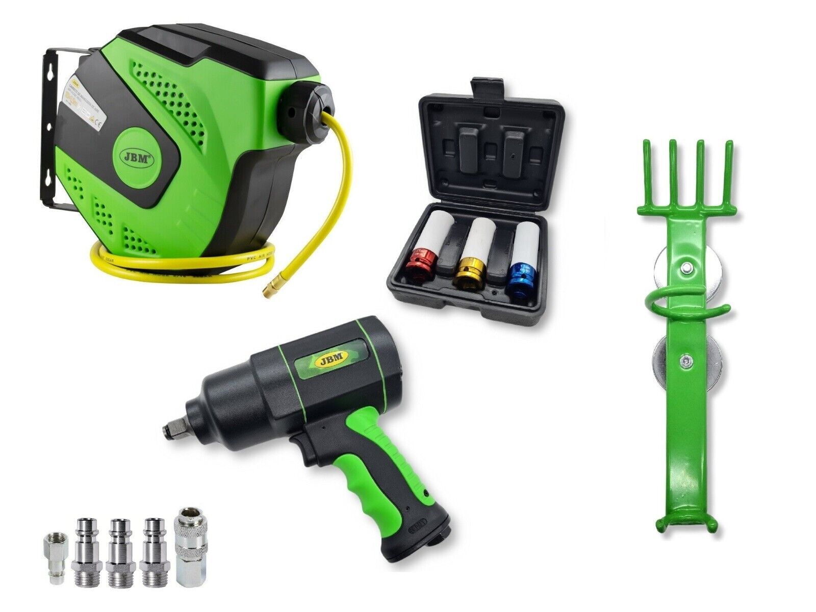 Avvolgitubo aria 10 mt. + pistola pneumatica 1/2" 1200Nm più tris di bussole per cerchi in lega più supporto per avvitatore e bussole magnetico.