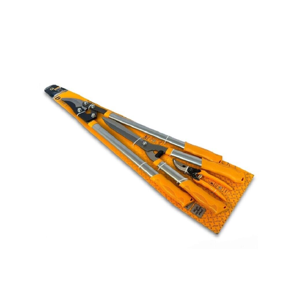 Comodissimo kit per il giardinaggio, composto da una tagliasiepi manuale, una tronca rami e una forbice da potatura con impugnatura soft grip e lama in acciaio al carbonio. Perfetto set per agricoltura e giardinaggio.