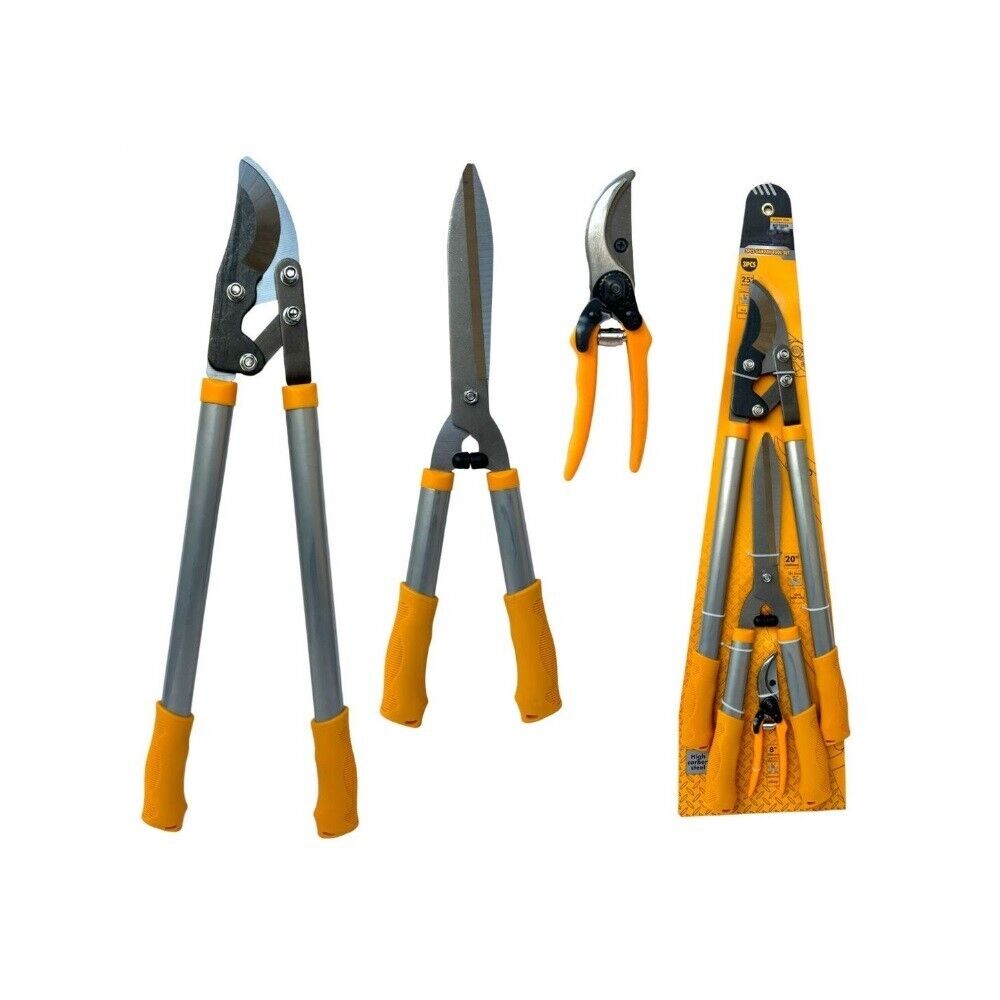 Comodissimo kit per il giardinaggio, composto da una tagliasiepi manuale, una tronca rami e una forbice da potatura con impugnatura soft grip e lama in acciaio al carbonio. Perfetto set per agricoltura e giardinaggio.