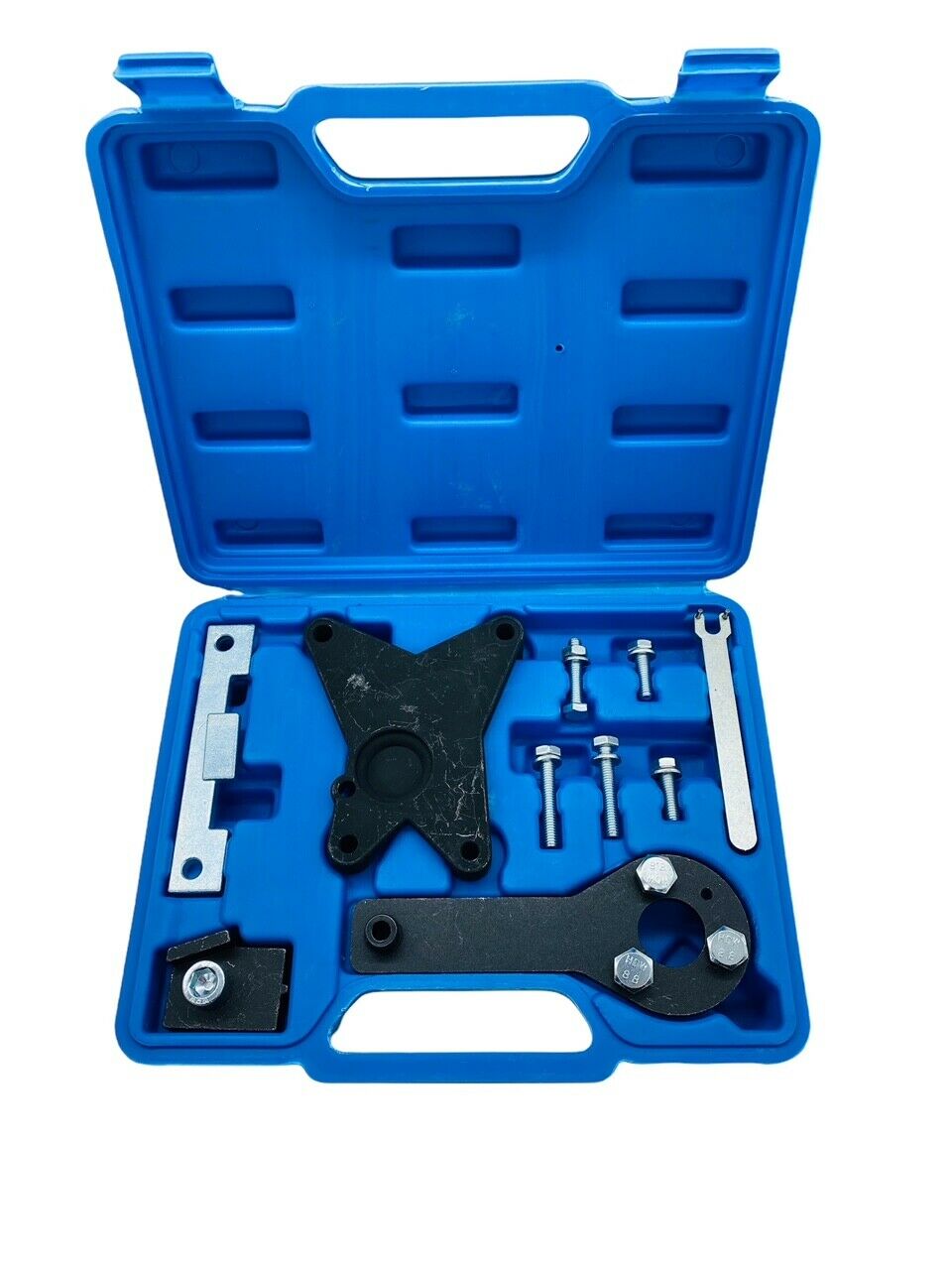 Composto da attrezzo per il bloccaggio dell'albero motore, piastra di regolazione degli alberi a camme, tendicinghia regolatore per il motore 1.2 e ulteriori attrezzi di bloccaggio pignone e albero a camme sulle 1.4 VVT.