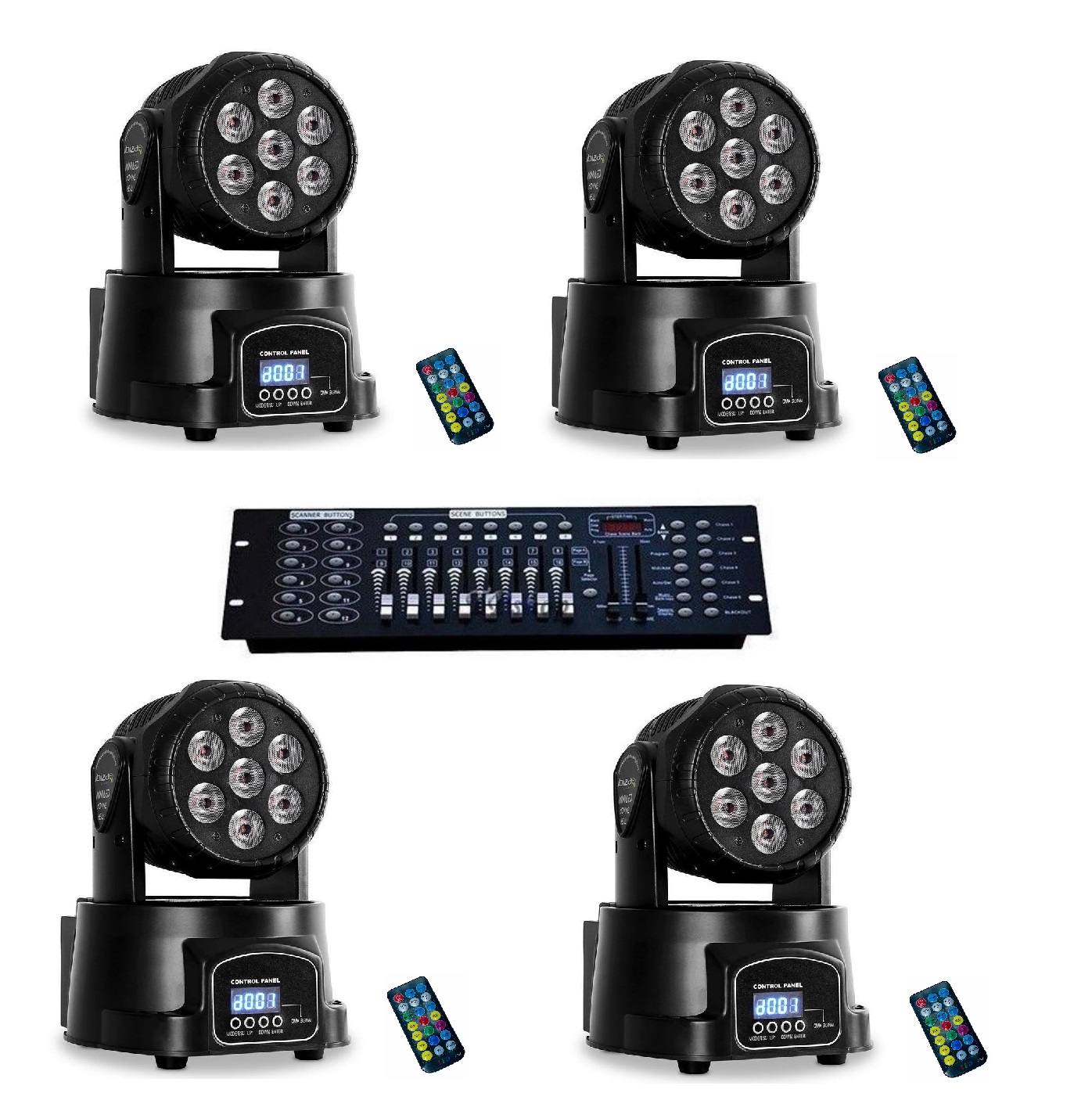 Kit 4 Proiettori Led Rgb testa mobile rotante con 7 Led WASH DMX Mixer dmx 192