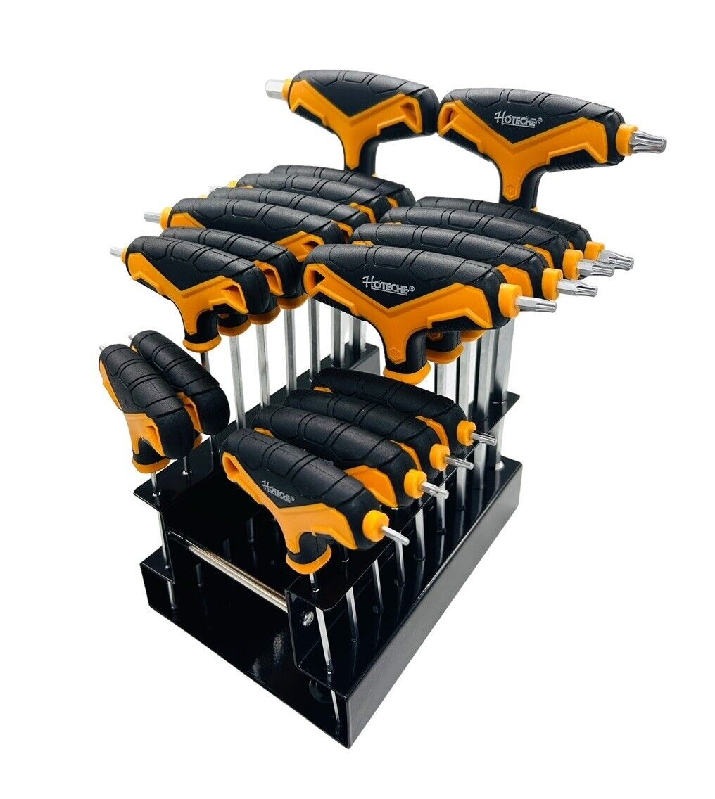Magnifica serie di chiavi a brugola esagonali a testa sferica e torx in acciaio al cromo vanadio. Il kit è contenuto su comodissimo espositore in metallo.