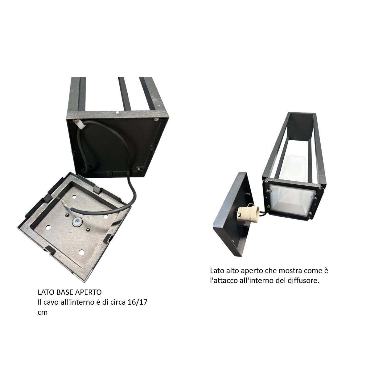 La struttura è realizzata in alluminio verniciato di alta qualità, progettata per resistere nel tempo agli agenti atmosferici, mentre il diffusore in PC opalino assicura una distribuzione uniforme della luce, riducendo l’abbagliamento e migliorando il comfort visivo.