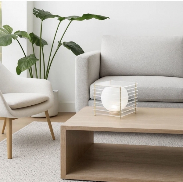 Questa lampada da tavolo di design è un vero elemento d’arredo capace di unire luce, eleganza e carattere contemporaneo. Il cuore luminoso è una raffinata sfera opalina che diffonde una luce morbida e avvolgente, racchiusa all’interno di una struttura geometrica trasparente impreziosita da dettagli con finitura oro, per un effetto scenografico e moderno.