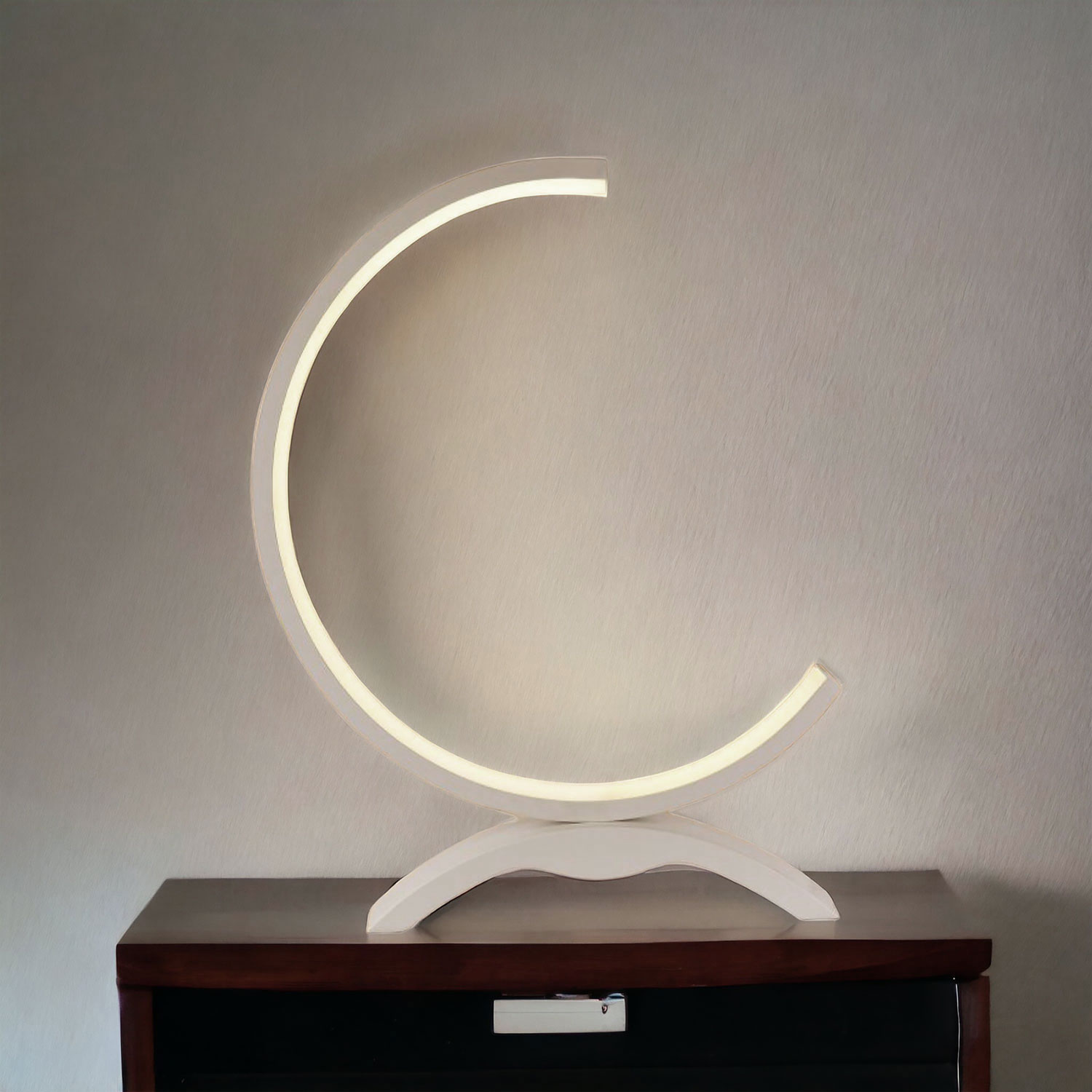 • Lampada dal design moderno con forma di cerchio aperto. Particolarmente indicata per ambienti moderni da posizionare su scrivanie, mobiletti bassi o in camera da letto.
