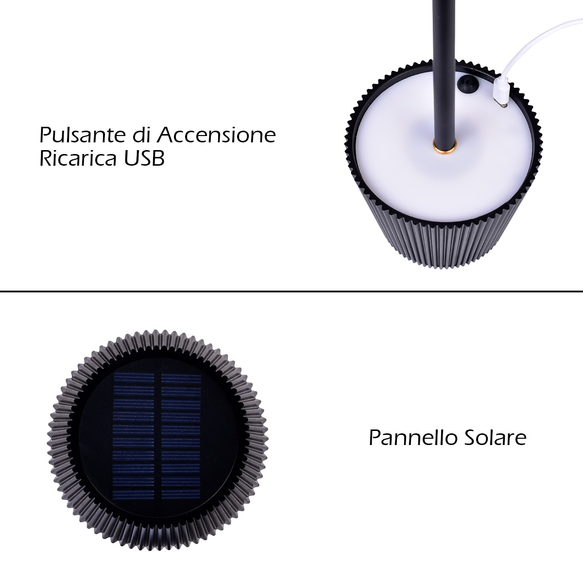 Uno degli aspetti più innovativi di questa lampada da tavolo è il suo sistema di doppia ricarica: energia solare + USB. Durante il giorno può essere posizionata in prossimità di una finestra o all’esterno per assorbire l’energia solare grazie al pannello integrato, mentre in caso di necessità può essere facilmente ricaricata tramite il cavo USB incluso, collegandola a una normale presa o a un power bank. Questo la rende perfetta anche in situazioni in cui non è disponibile una presa elettrica, ad esempio durante eventi all’aperto, in giardini, terrazze, o ambienti di ristorazione all’esterno.