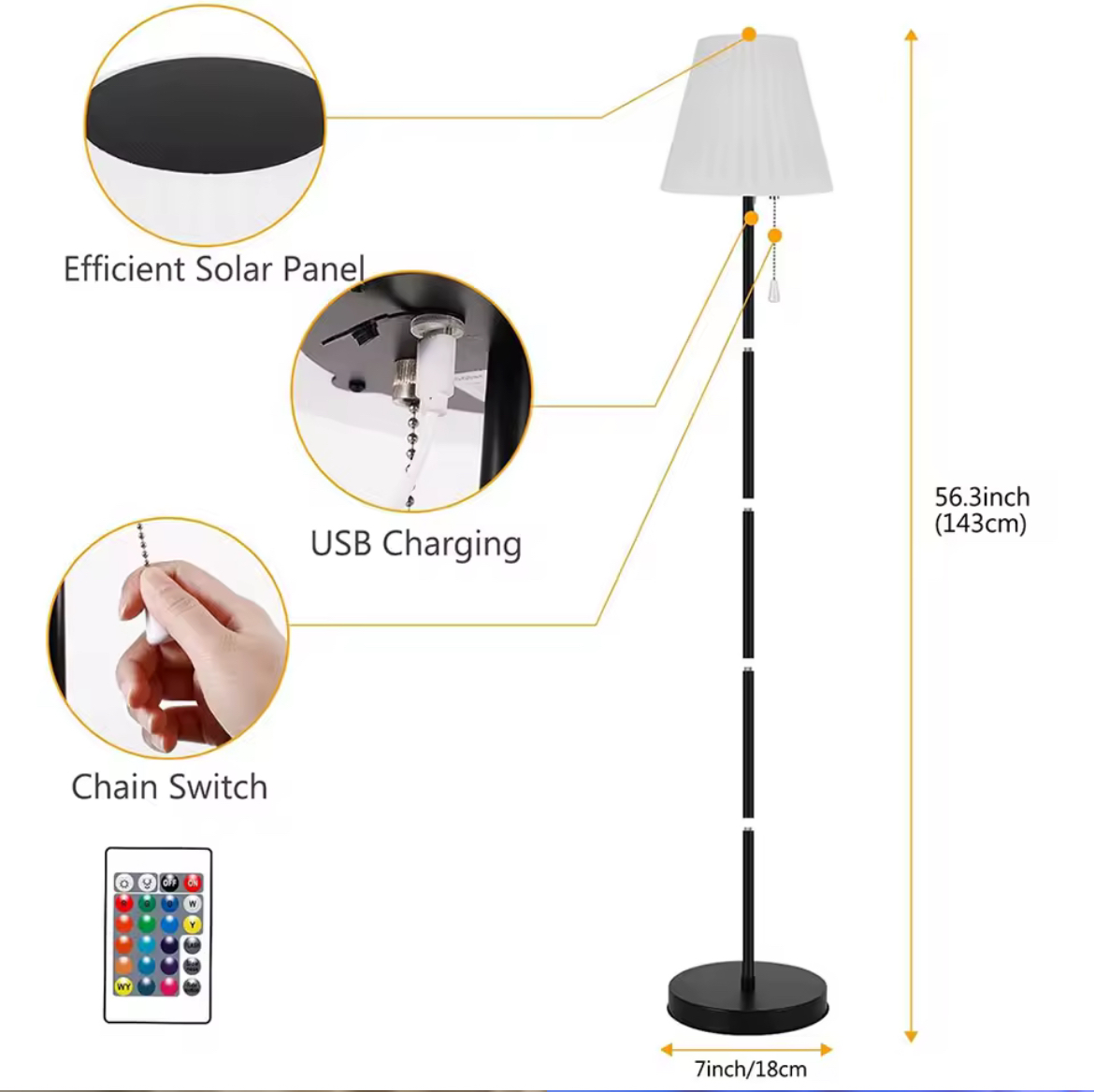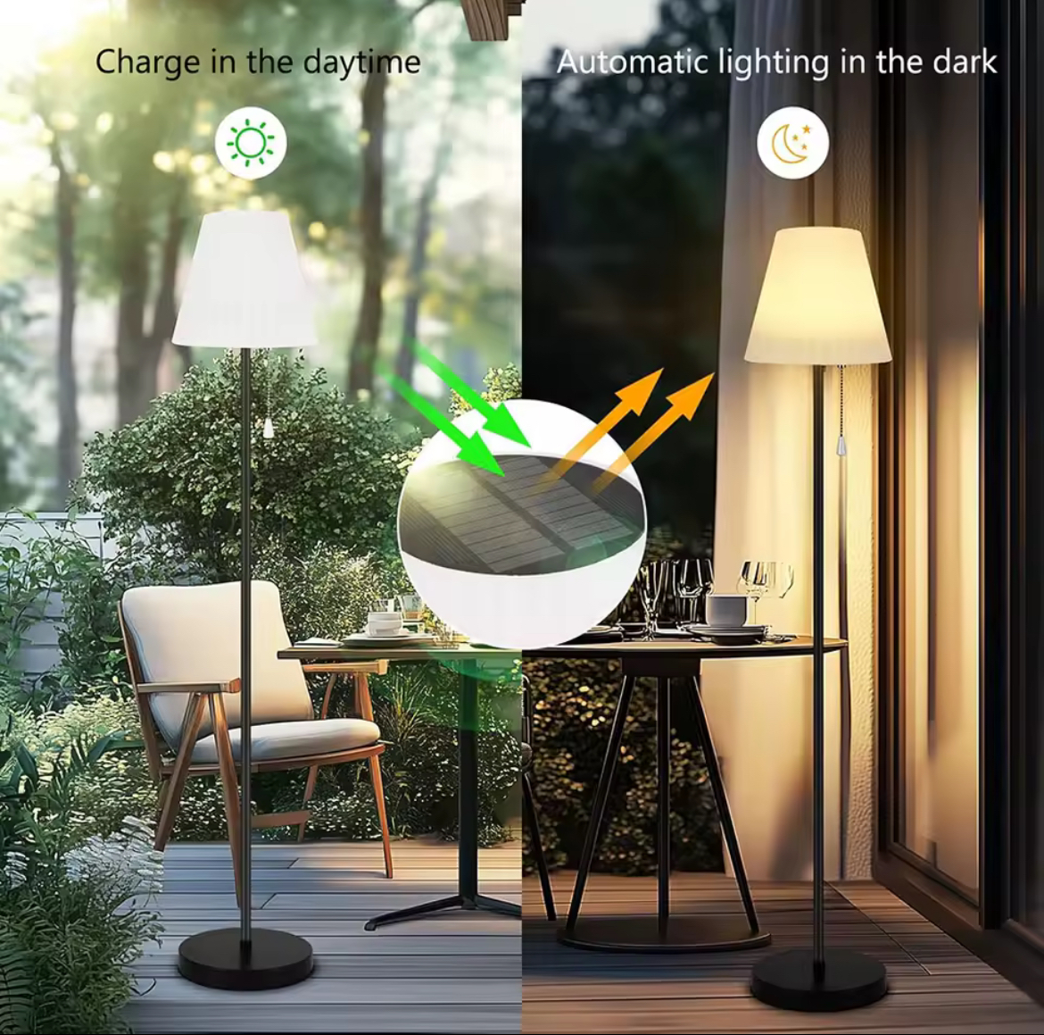 La lampada è dotata di un pannello solare ad alta efficienza e di una porta USB per la ricarica alternativa, garantendo sempre piena autonomia anche in assenza di luce solare diretta. Ideale per giardini, terrazzi, balconi, bar, ristoranti e locali all’aperto. Funziona completamente senza fili, offrendo grande libertà di posizionamento e nessun vincolo elettrico.