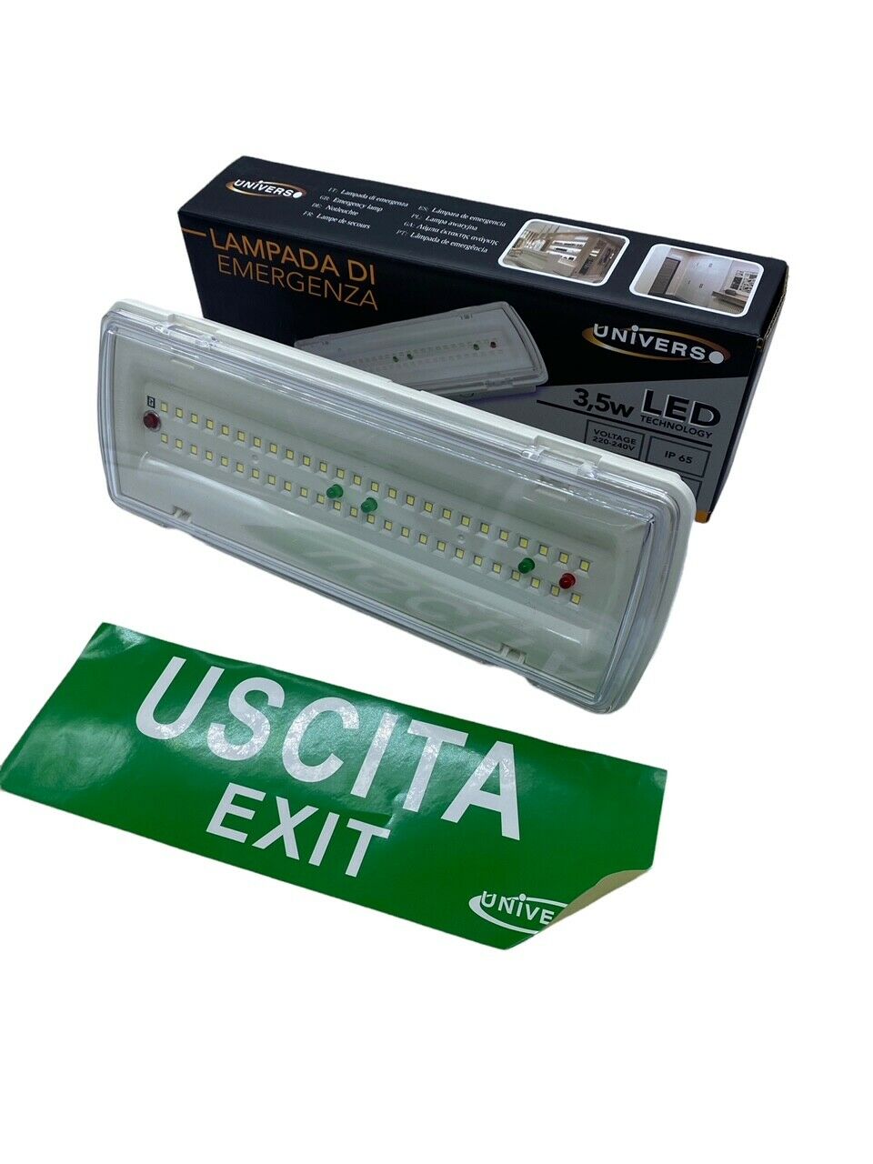 Lampada d'Emergenza con 50 LED mod. MG-01. Lampada realizzata in ABS di colore bianco e copertura trasparente in plastica. Realizzata con 50 LED SMD con fascio luminoso di tipo diffuso e flusso luminoso totale di 400 lm. Adatto come dispositivo di sicurezza interna ed esterna della casa, grazie al grado di protezione IP65. Facile da montare, grazie alla connessione tramite morsetti a vite. Se connessa alla rete elettrica, si accenderà automaticamente in caso di interruzione della stessa, garantendo una durata di 3 ore. La batteria interna (Li-ion 7,4V e 1500mAh) si ricarica in 7 ore quando completamente scarica. Sul retro della lampada sono presenti fori per poterla fissare a muro. Lampada di emergenza dotata di LED di colore verde che indica lo stato di carica e pulsante di autotest. Nella confezione riceverete le viti per il fissaggio a muro (queste le troverete all'interno della lampada), 1 pittogramma adesivo per uscita di sicurezza.