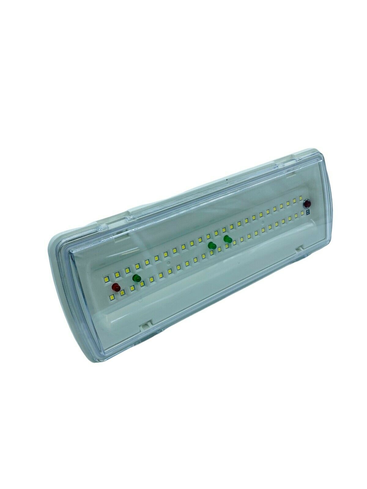 Lampada d'Emergenza con 50 LED mod. MG-01. Lampada realizzata in ABS di colore bianco e copertura trasparente in plastica. Realizzata con 50 LED SMD con fascio luminoso di tipo diffuso e flusso luminoso totale di 400 lm. Adatto come dispositivo di sicurezza interna ed esterna della casa, grazie al grado di protezione IP65. Facile da montare, grazie alla connessione tramite morsetti a vite. Se connessa alla rete elettrica, si accenderà automaticamente in caso di interruzione della stessa, garantendo una durata di 3 ore. La batteria interna (Li-ion 7,4V e 1500mAh) si ricarica in 7 ore quando completamente scarica. Sul retro della lampada sono presenti fori per poterla fissare a muro. Lampada di emergenza dotata di LED di colore verde che indica lo stato di carica e pulsante di autotest. Nella confezione riceverete le viti per il fissaggio a muro (queste le troverete all'interno della lampada), 1 pittogramma adesivo per uscita di sicurezza.