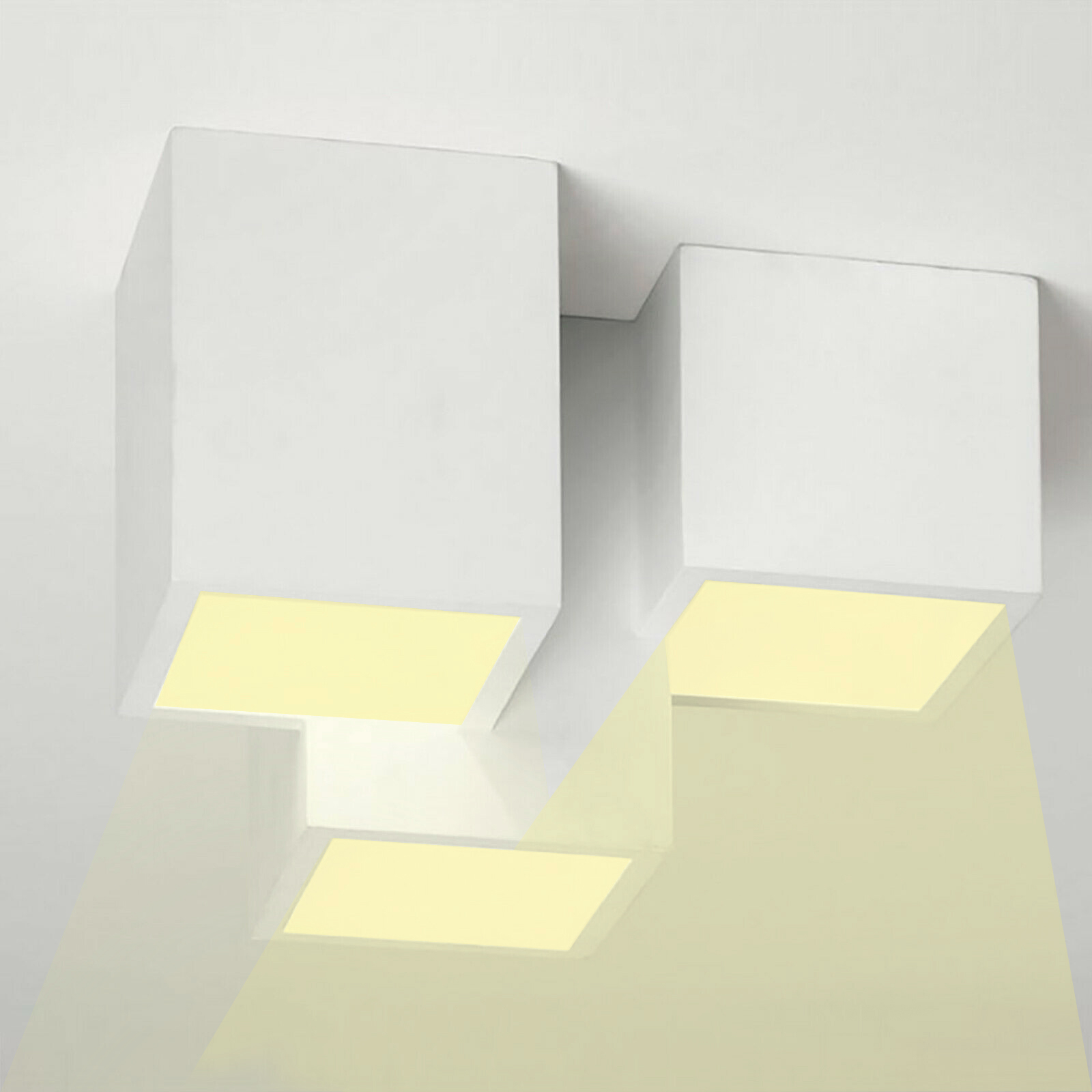 • La struttura di questa lampada in gesso è realizzata in gesso bianco e può essere dipinta con colori specifici all'acqua secondo l'arredamento. Ha una forma di 3 cubi posti in modo sfalsato. La luce diffusa è emessa in modo concentrata a seconda del grado e del tipo di lampada inserita. La lampada da soffitto è provvista di tre portalampade attacco GU10, le lampade sono intercambiabili quindi in caso di rottura è semplicemente sostituibile.