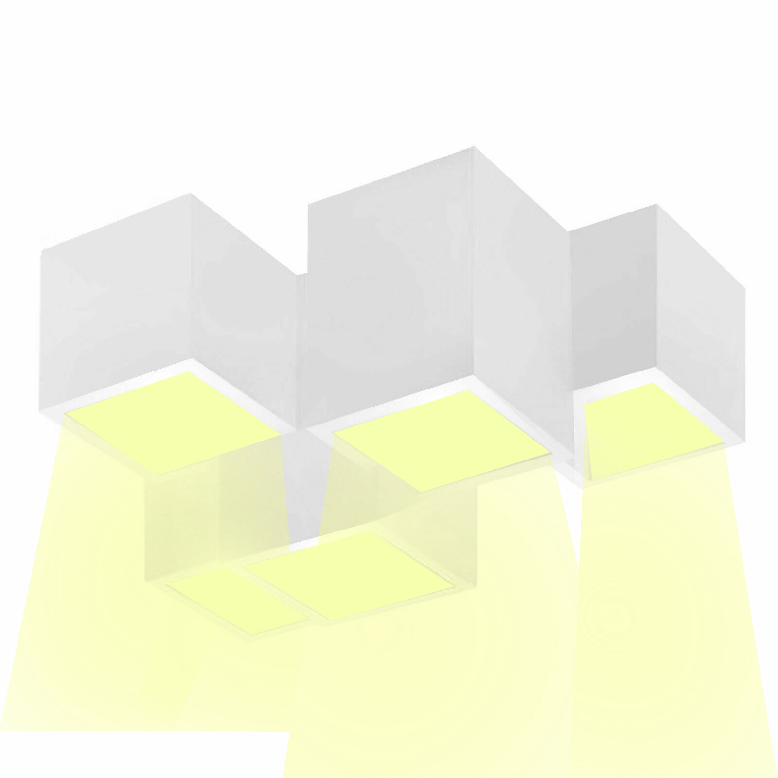 • La struttura di questa lampada in gesso è realizzata in gesso bianco e può essere dipinta con colori specifici all'acqua secondo l'arredamento. Ha una forma di 5 cubi posti in modo sfalsato. La luce diffusa è emessa in modo concentrata a seconda del grado e del tipo di lampada inserita. La lampada da soffitto è provvista di 5 portalampade attacco GU10, le lampade sono intercambiabili quindi in caso di rottura è semplicemente sostituibile.
