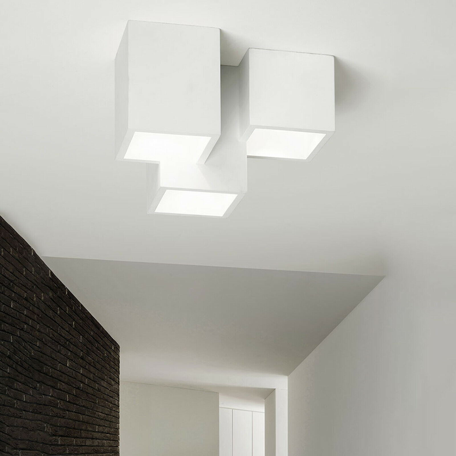 • La struttura di questa lampada in gesso è realizzata in gesso bianco e può essere dipinta con colori specifici all'acqua secondo l'arredamento. Ha una forma di 3 cubi posti in modo sfalsato. La luce diffusa è emessa in modo concentrata a seconda del grado e del tipo di lampada inserita. La lampada da soffitto è provvista di tre portalampade attacco GU10, le lampade sono intercambiabili quindi in caso di rottura è semplicemente sostituibile.