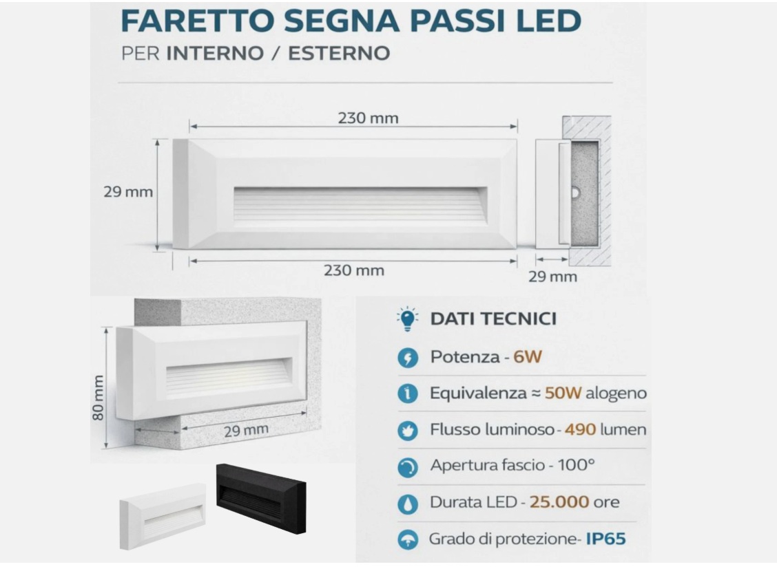 La lampada segnapasso LED da incasso o superfice piana è progettata per illuminare percorsi, scale e corridoi con una luce downlight orientata verso il basso, evitando abbagliamenti e garantendo comfort visivo.
