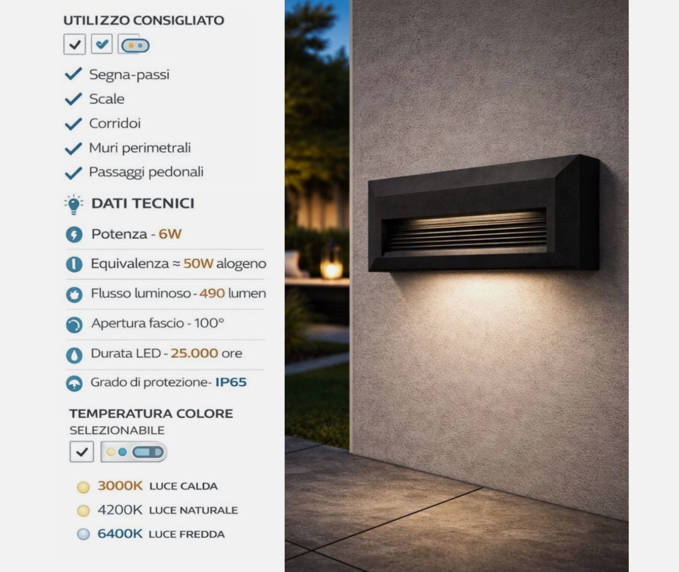 Questo segnapasso LED è progettato per installazione a parete ad incasso o superfice piana ed è alimentato direttamente a 220V, senza necessità di alimentatori esterni. La tecnologia CCT integrata permette di selezionare la temperatura colore tra luce calda 3000K, luce naturale 4200K e luce fredda 6400K prima del montaggio, adattandosi a qualsiasi ambiente.