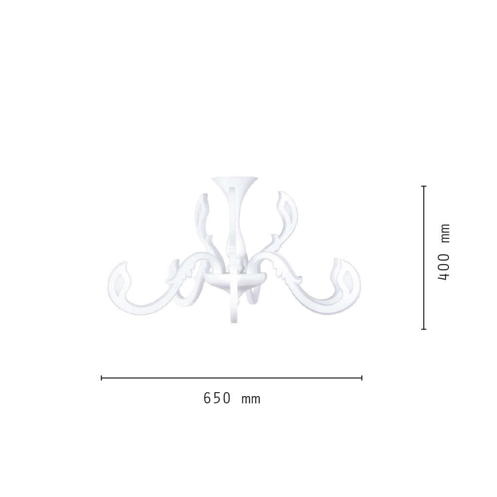 Lampadario dalla singolare forma e dal corpo bianco interamente realizzato in termoplastica con paralume in acrilico trasparente e chip led integrati.