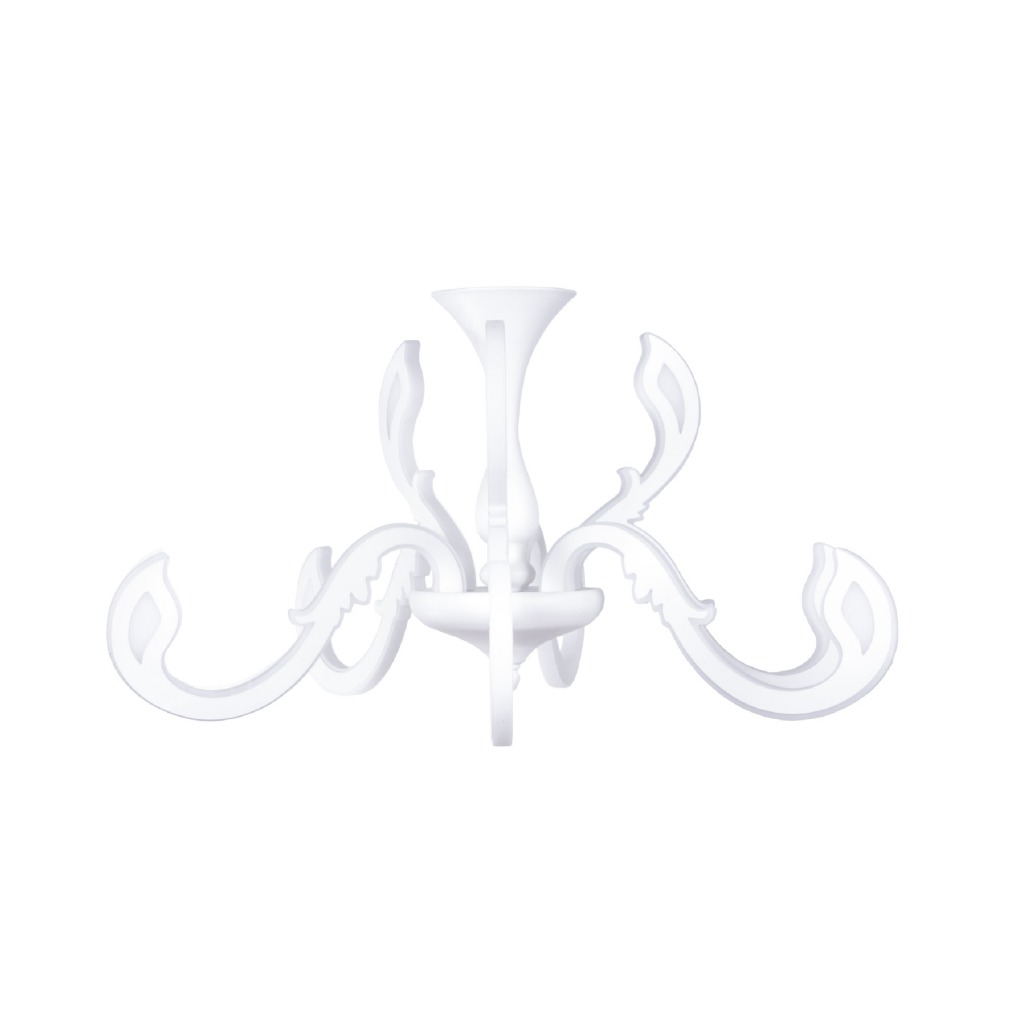 Lampadario dalla singolare forma e dal corpo bianco interamente realizzato in termoplastica con paralume in acrilico trasparente e chip led integrati.