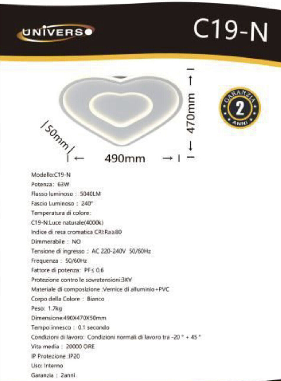 • Ottima resa luminosa grazie ai suoi 63w che coprono un fascio di luce di 240° e di semplice installazione