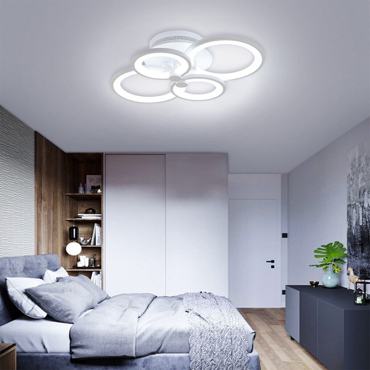 1. Meraviglioso Lampadario a plafoniera con illuminazione led dallo stile moderno e tridimensionale a 4 Cerchi Luminosi I suoi lineamenti geometrici lo rendono una fonte luminosa ideale per valorizzare ambienti di casa come salotto, camera da letto, cucina e studio, ma anche spazi pubblici come negozi, ristoranti e uffici. Ottima resa luminosa grazie ai suoi 30wx2 che coprono un fascio di luce di 300° e di semplice installazione (VA MONTATO) Caratteristiche Potenza: 78X2w Flusso luminoso: 2200 lumen Tensione di ingresso: AC 220-240V Hertz: 50-60Hz DIMMERABILE Fascio luminoso: 300° Materiale di composizione: metallo+acrilico Colore prodotto: bianco Tempo di innesco: 0.1 secondi Grado di protezione: IP20 Dimensioni Lunghezza: 600 mm Larghezza: 400 mm Spessore: 50 mm circa Il lampadario Plafoniera ha 3 tonalità di luce: calda, naturale, fredda  che possono essere cambiate e dimmerate direttamente da TELECOMANDO.