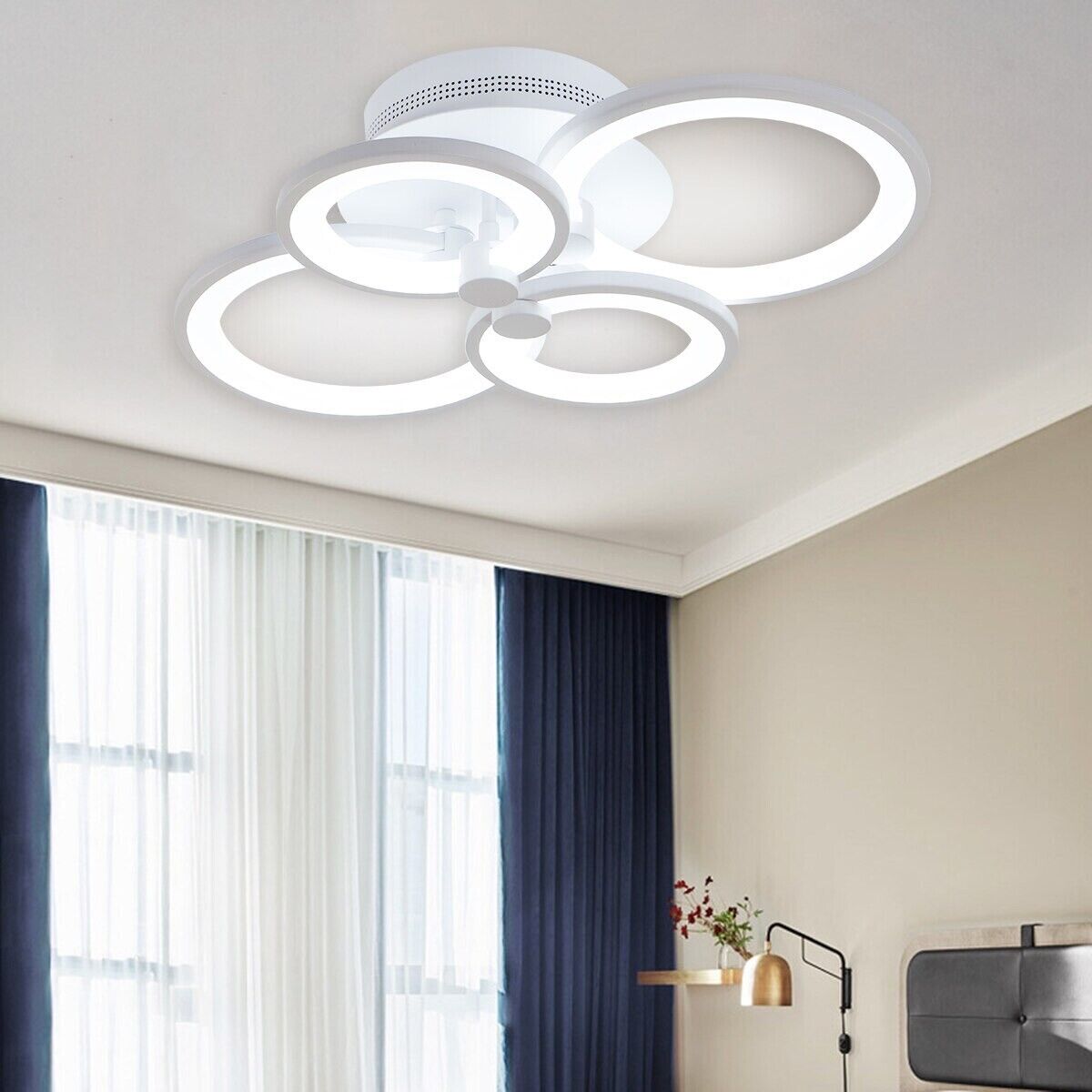 1. Meraviglioso Lampadario a plafoniera con illuminazione led dallo stile moderno e tridimensionale a 4 Cerchi Luminosi I suoi lineamenti geometrici lo rendono una fonte luminosa ideale per valorizzare ambienti di casa come salotto, camera da letto, cucina e studio, ma anche spazi pubblici come negozi, ristoranti e uffici. Ottima resa luminosa grazie ai suoi 30wx2 che coprono un fascio di luce di 300° e di semplice installazione (VA MONTATO) Caratteristiche Potenza: 78X2w Flusso luminoso: 2200 lumen Tensione di ingresso: AC 220-240V Hertz: 50-60Hz DIMMERABILE Fascio luminoso: 300° Materiale di composizione: metallo+acrilico Colore prodotto: bianco Tempo di innesco: 0.1 secondi Grado di protezione: IP20 Dimensioni Lunghezza: 600 mm Larghezza: 400 mm Spessore: 50 mm circa Il lampadario Plafoniera ha 3 tonalità di luce: calda, naturale, fredda  che possono essere cambiate e dimmerate direttamente da TELECOMANDO.