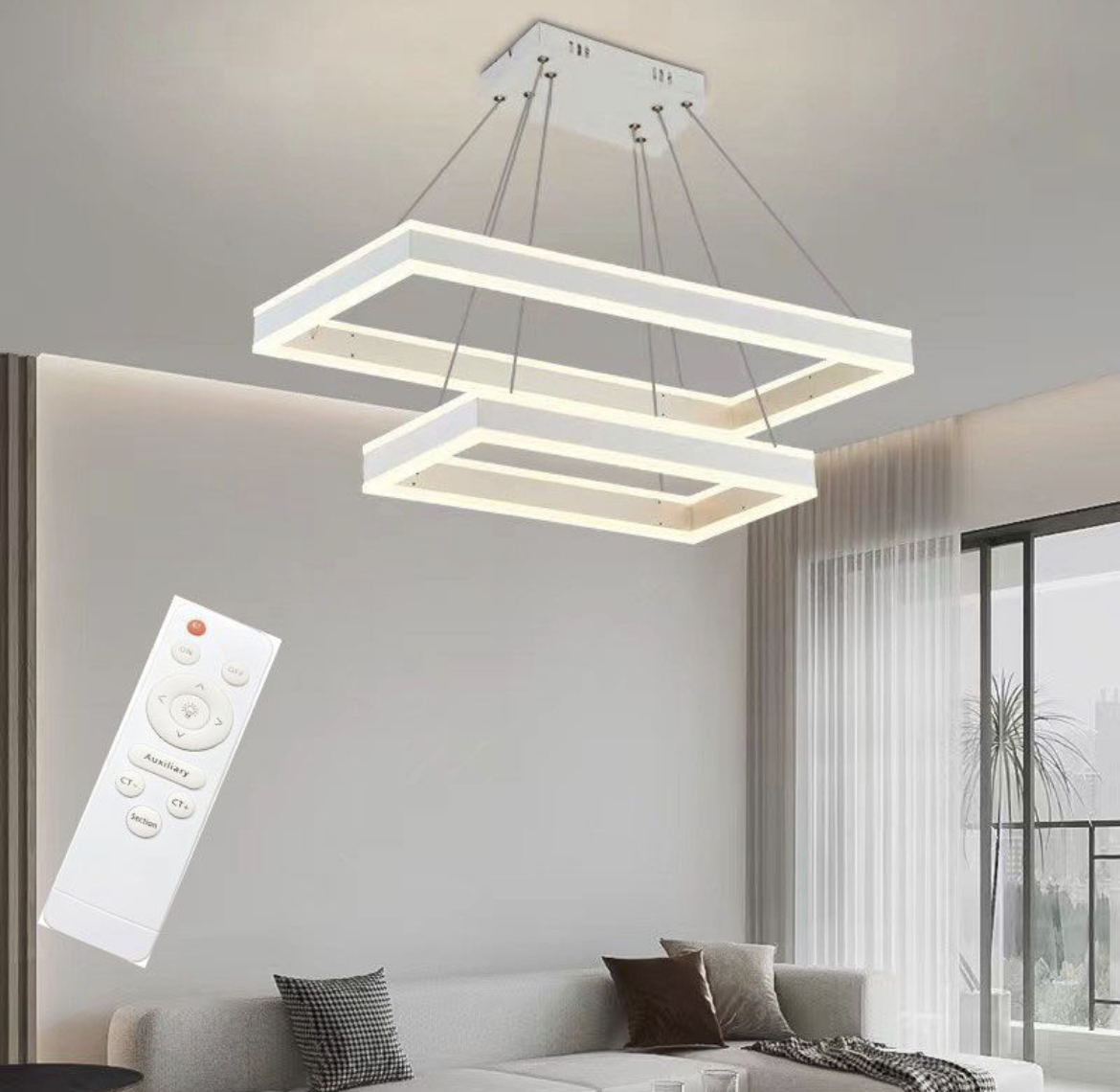 Lampadario plafoniera a sospensione led illuminazione interni cambia 3 luci 64w con telecomando dimmerabile