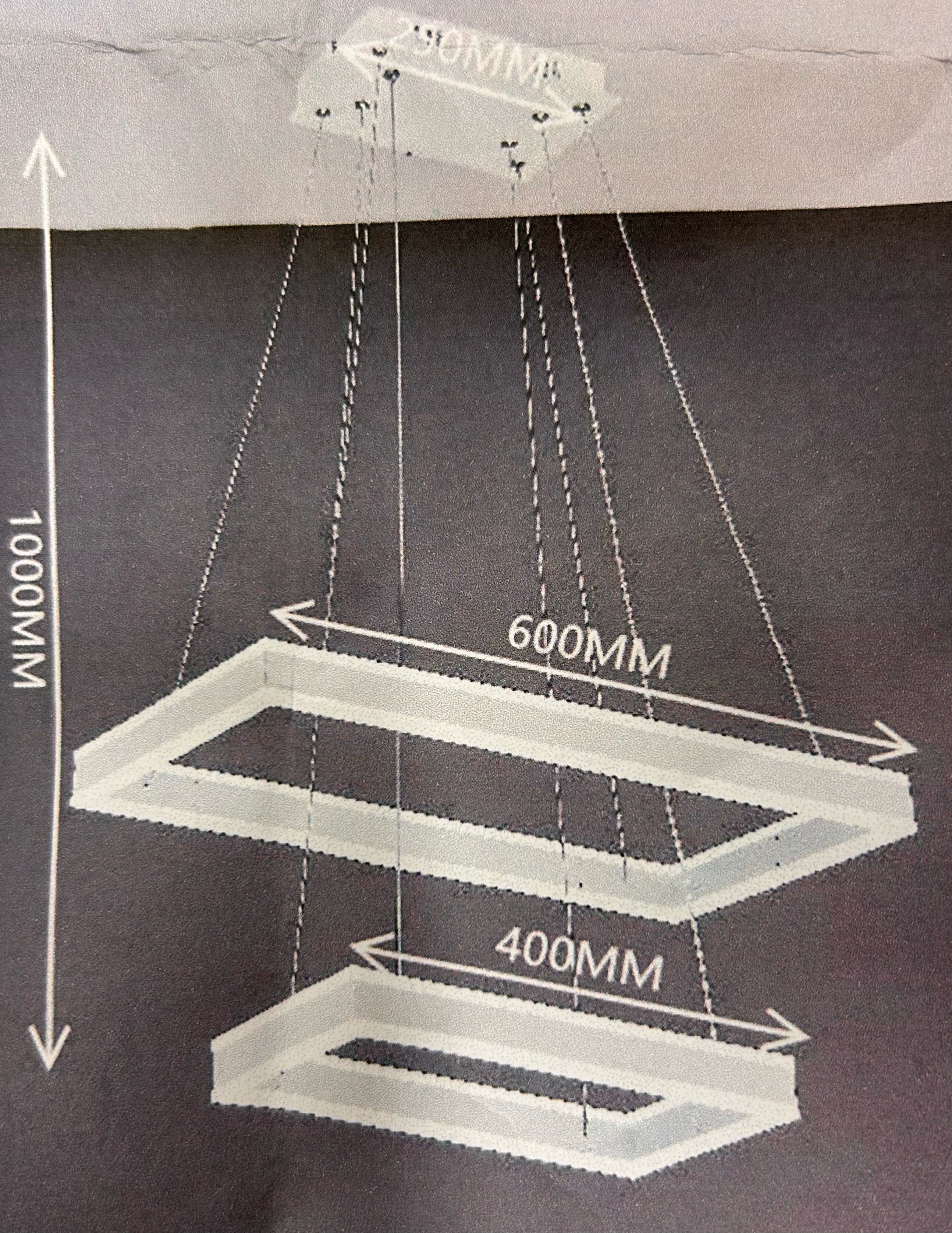 - Dimensioni: base a soffitto 250x120 mm, rettangolo grande 600x300mm, rettangolo piccolo 400x200mm, cavi regolabili da 300 mm a 1000mm