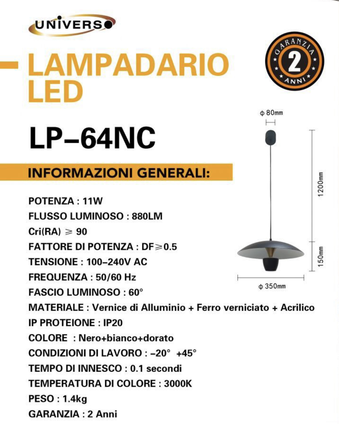 • Caratteristiche teniche: Potenza 11W, Luminosità 880 Lumen, funziona a 220v e deve essere collegato ad interruttore a parete, Peso 1.4 kg. Led a luce calda 3000K.