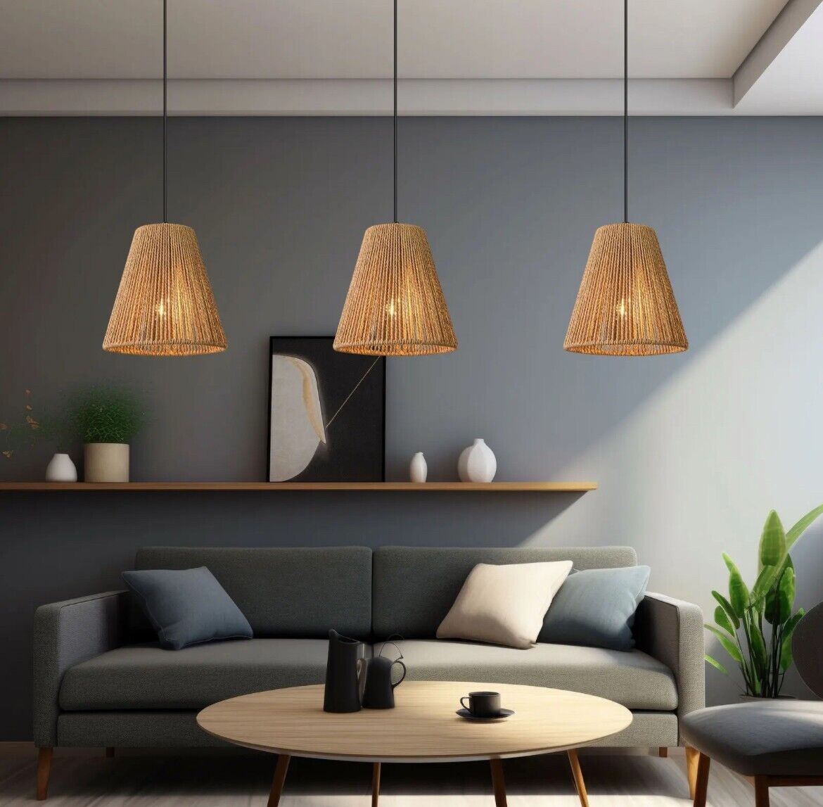 • Effetto di Luci e Ombre: Il paralume in corde di canapa intrecciate, crea una suggestiva combinazione di luci e ombre quando la lampada è accesa. Un vero punto focale che si adatta perfettamente in cucina, soggiorno o sopra il tavolo da pranzo.