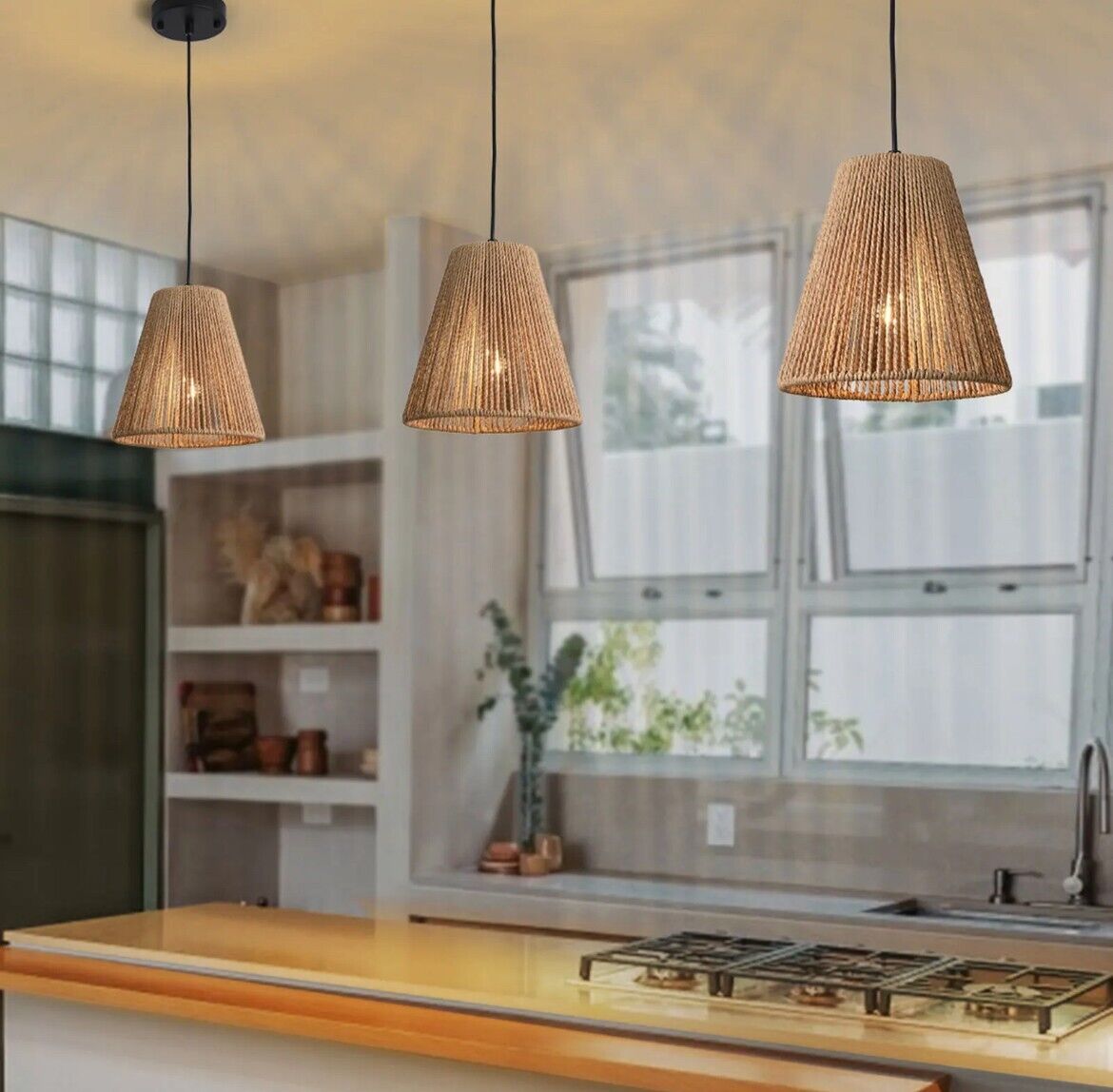• Effetto di Luci e Ombre: Il paralume in corde di canapa intrecciate, crea una suggestiva combinazione di luci e ombre quando la lampada è accesa. Un vero punto focale che si adatta perfettamente in cucina, soggiorno o sopra il tavolo da pranzo.