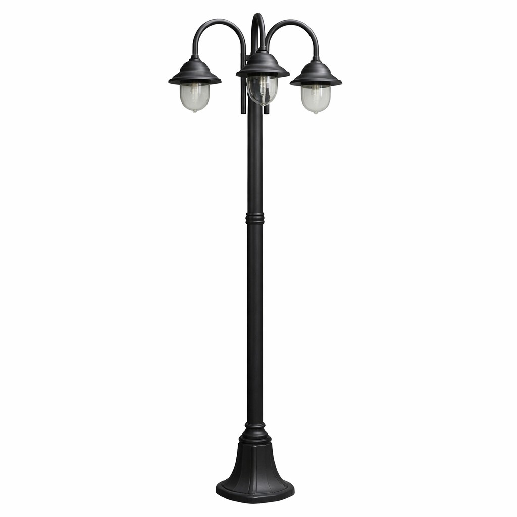La struttura in alluminio resistente e i diffusori in PVC trasparente garantiscono affidabilità, sicurezza e durata nel tempo. Grazie ai tre portalampada E27, il lampione offre una luce diffusa e accogliente, ideale per valorizzare vialetti, ingressi, giardini e percorsi pedonali.