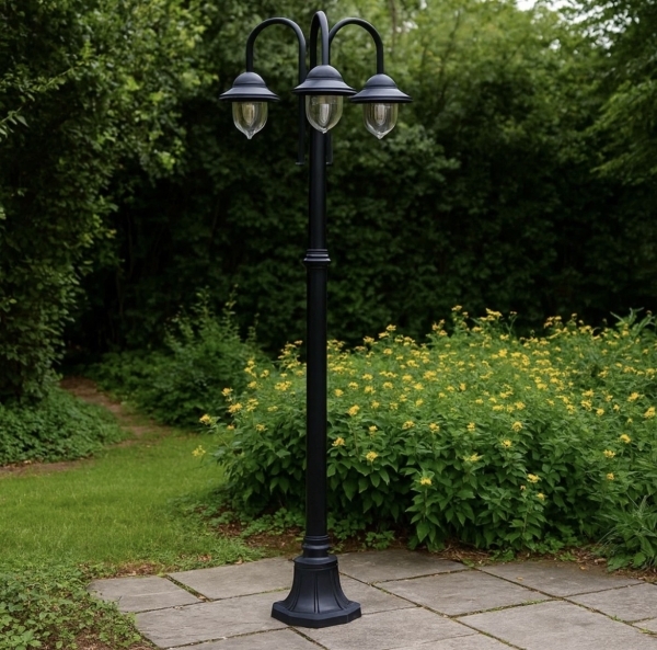 Questo lampione da giardino a tre luci è una soluzione di illuminazione esterna progettata per ambienti classici, tradizionali e retrò, dove estetica e funzionalità devono convivere armoniosamente.