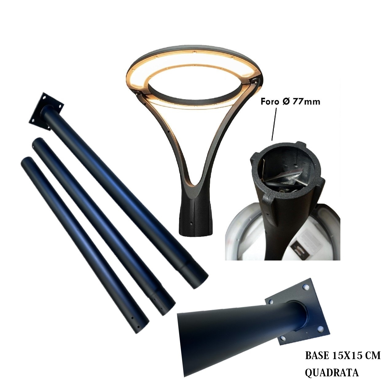 • MISURE DEL LAMPIONE: 500mm x 520mm x 77mm - SUPPORTA PALI CON DIAMETRO MASSIMO DI 77mm MISURE DEL PALO: COMPOSTO DA 3 COPRI DA 1 METRO CADAUNO CHE UNITI ARRIVANO A 3 METRI. BASE 15X15 COMPLETO DI FISSAGGI