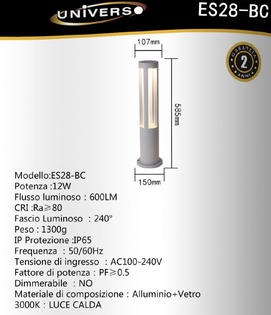 NOTA BENE: Il lampione ha grado di protezione IP65 che lo protegge da fattori atmosferici, ma non ha garanzia per sverniciamento da calcare (dovuto solo ad acqua potabile, non piovana) e da Salsedine se si è vicino al mare. Per tanto qualora il Palo fosse posizionato in giardino dove vi è impianto di irrigazione e viene bagnato da acqua potabile comune di fontana, va asciugato. Perchè non vi sarà fornita garanzia in caso di proliferazione CALCARE