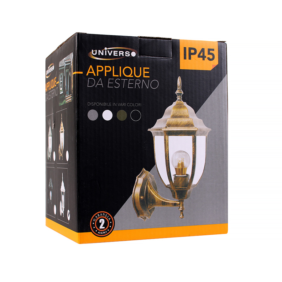 L'illuminazione esterna della tua casa o del tuo spazio commerciale non è mai stata così elegante e funzionale grazie alla nostra innovativa lanterna da parete bianca IP45 con attacco E27. Realizzata con materiali di alta qualità, questa lanterna da parete vanta una struttura in alluminio resistente agli agenti atmosferici e un vetro trasparente che insieme garantiscono durabilità e una diffusione ottimale della luce. Il colore bianco della struttura aggiunge un tocco di raffinatezza e versatilità, permettendole di integrarsi armoniosamente con ogni tipo di esterno, sia esso l'ingresso di una casa moderna o il giardino di una villa in stile classico. Dotata di un attacco E27, questa applique da parete è compatibile con una vasta gamma di lampadine, consentendoti di scegliere l'intensità e il tono di luce più adatti alle tue esigenze. Che tu preferisca una luce calda per creare un'atmosfera accogliente o una più fredda per un'illuminazione più funzionale, la nostra lanterna saprà adattarsi perfettamente. Il grado di protezione IP45 assicura che questa lanterna sia protetta contro l'infiltrazione di corpi solidi e liquidi, rendendola ideale per l'uso esterno in tutte le condizioni meteorologiche. Da un lato, il design trasparente del vetro permette una diffusione luminosa ottimale, dall'altro, la robusta struttura in alluminio garantisce una lunga durata nel tempo. Con dimensioni di 365x190 mm e un peso di soli 0.7Kg, la lanterna è facile da installare e viene fornita con viti di fissaggio incluse, permettendoti di posizionarla dove più desideri con estrema semplicità. Che si tratti di illuminare l'entrata della tua abitazione, di valorizzare il percorso nel tuo giardino o di creare un'atmosfera suggestiva all'esterno del tuo negozio, questa lanterna rappresenta una soluzione di illuminazione esterna che coniuga estetica e funzionalità. Con il suo design ispirato al vintage questa applique si distingue per il suo stile unico che sa armonizzare luce e forma in un connubio perfetto