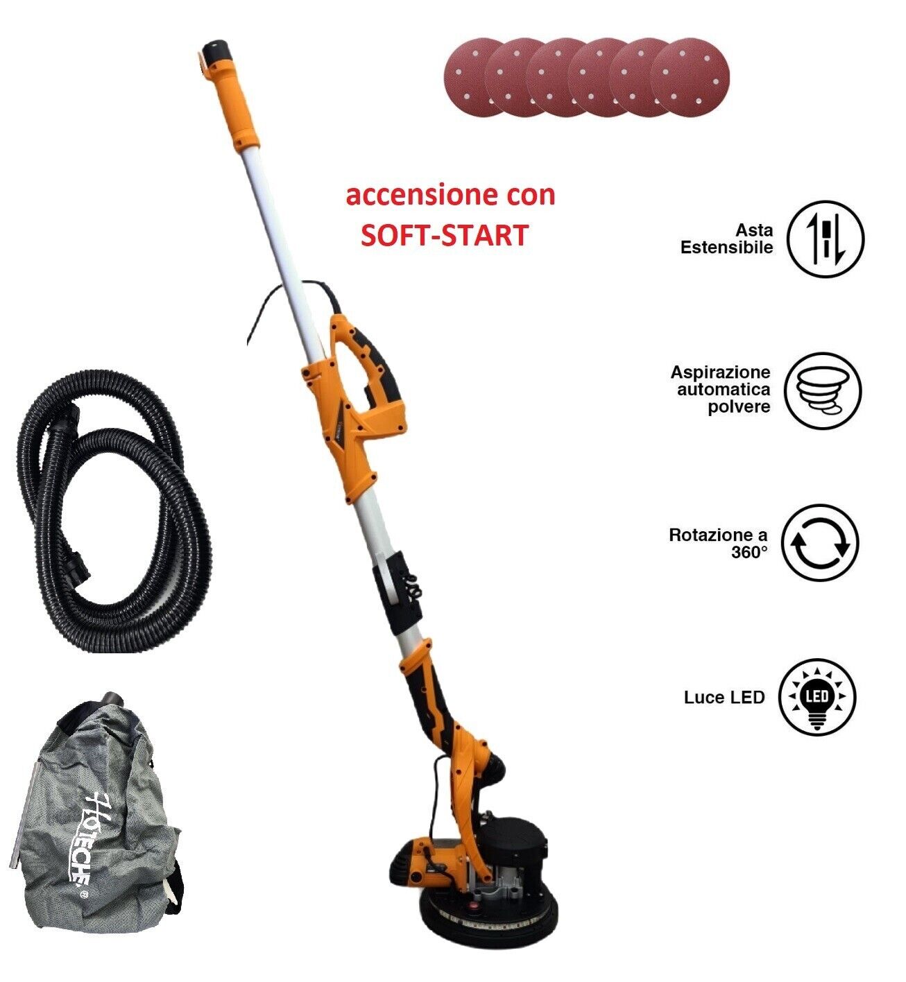 La levigatrice è fornita di sistema di aspirazione automatico della polvere che aspira la polvere provocata dal processo di levigatura incanalandola in un pratico sacco a zaino (incluso) attraverso un lungo tubo di aspirazione di ben 2mt, ciò garantisce un lavoro di levigatura più efficiente, preciso e soprattutto pulito.
