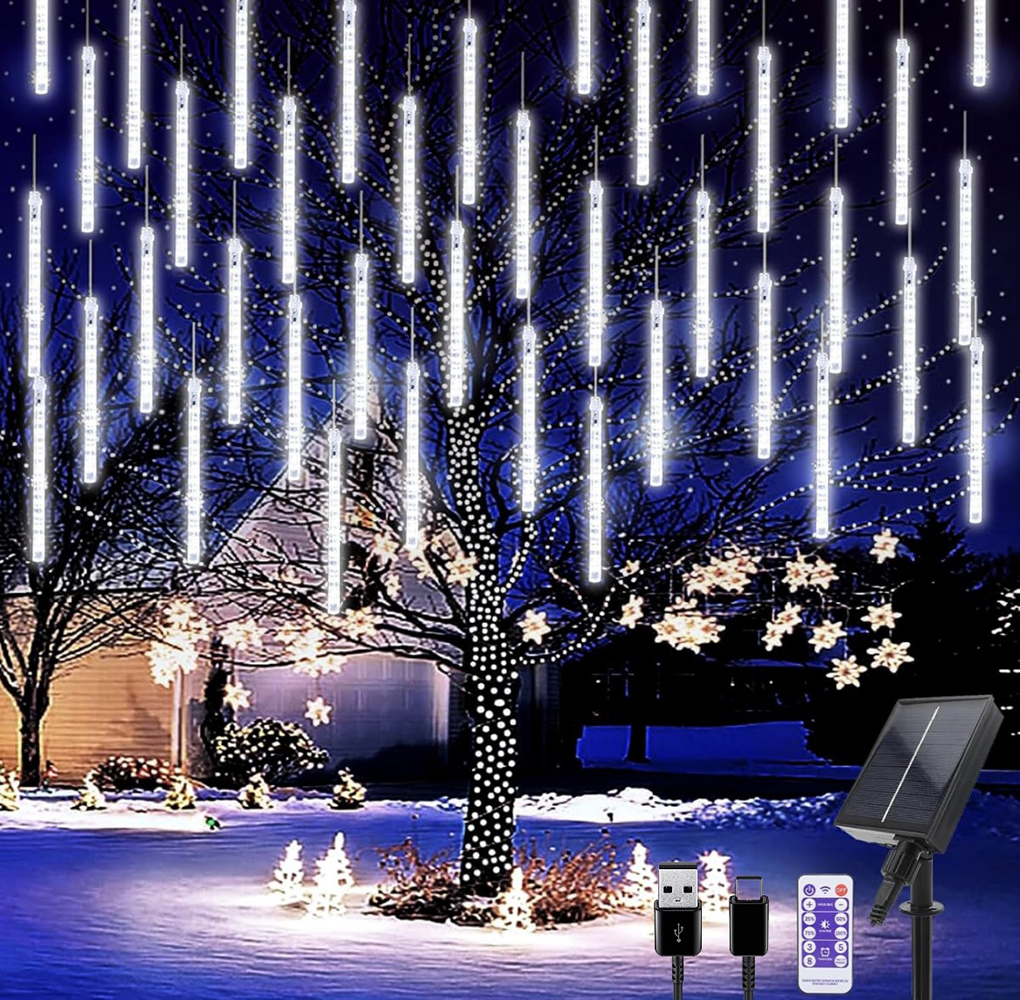 Luci di Natale Catena Luminosa natalizia a LED di 10 Meteoriti a Ricarica solare e USB con Telecomando luce fredda