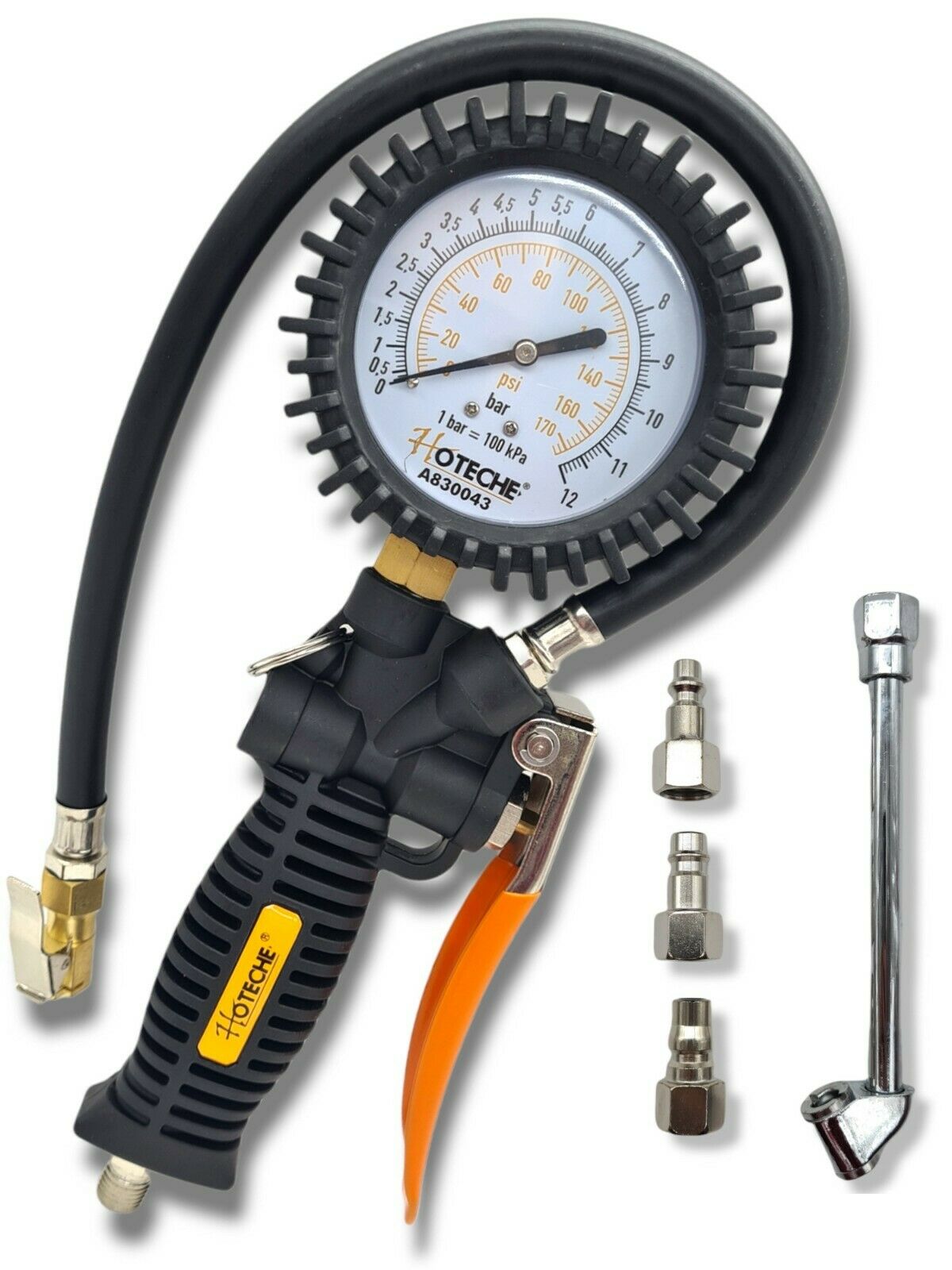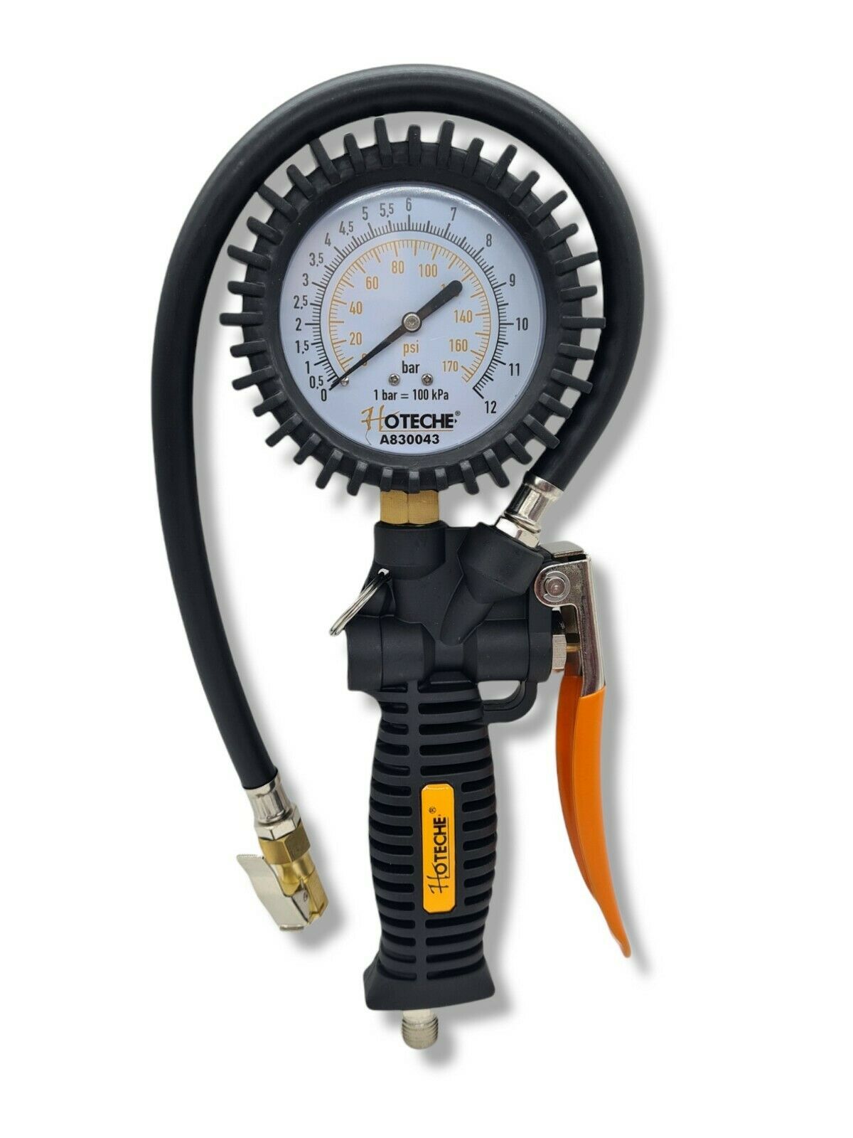 Manometro di altissima qualità, indicato per il gonfiaggio e il controllo della pressione di pneumatici di auto, moto, autobus, camion e mezzi pesanti.