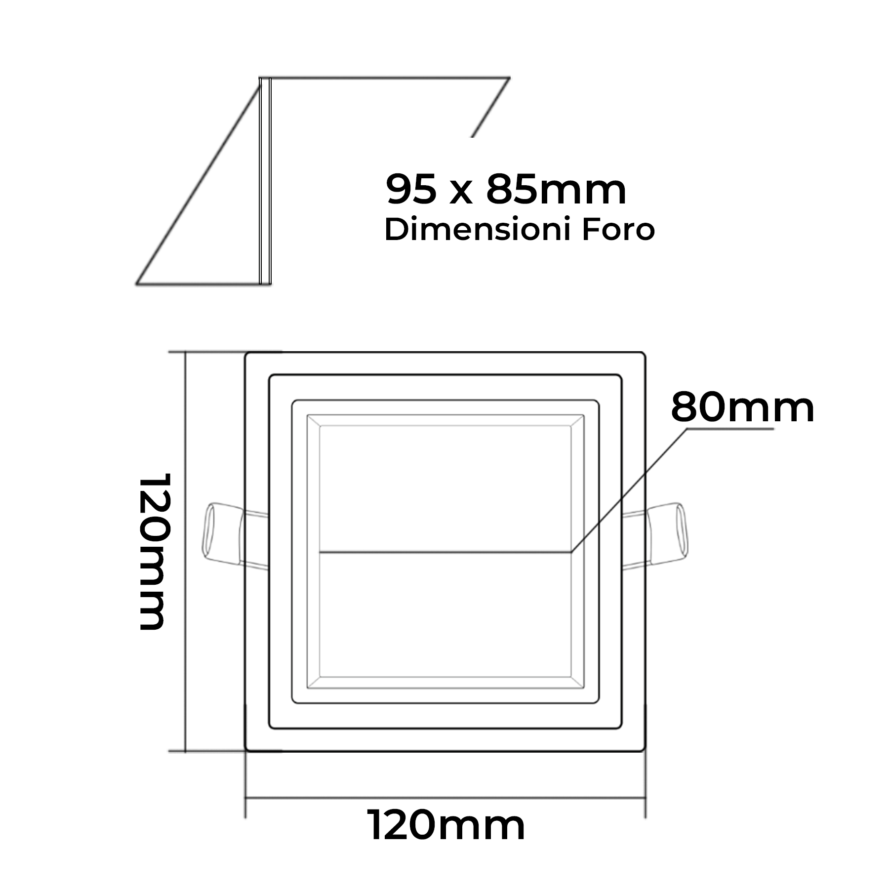 Infografica Pannello LED da Incasso Quadrato con Dimensioni 120x120mm e Foro di Incasso da 95x85mm