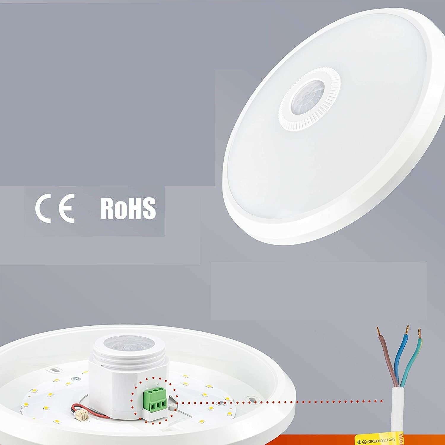 • Questa Plafoniera è una lampada a LED a risparmio energetico, che si accende e si spegne a seconda della luce del giorno. Può identificare quindi automaticamente il giorno o la notte utilizzando il rilevatore di energia a infrarossi IC, e la tecnologia SMD con prestazioni stabili ed affidabili. Led ad alta luminosità