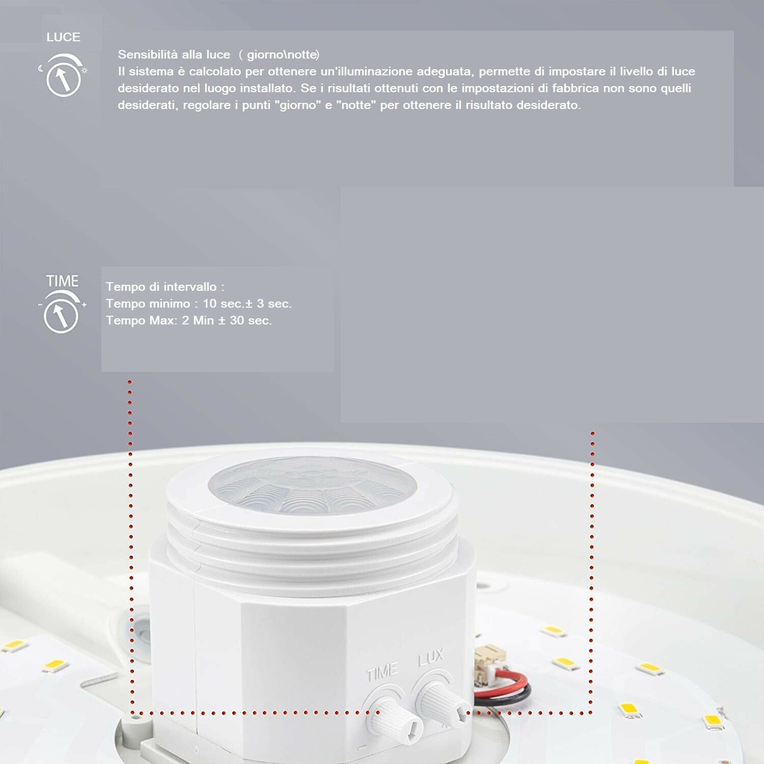 • Questa Plafoniera è una lampada a LED a risparmio energetico, che si accende e si spegne a seconda della luce del giorno. Può identificare quindi automaticamente il giorno o la notte utilizzando il rilevatore di energia a infrarossi IC, e la tecnologia SMD con prestazioni stabili ed affidabili. Led ad alta luminosità