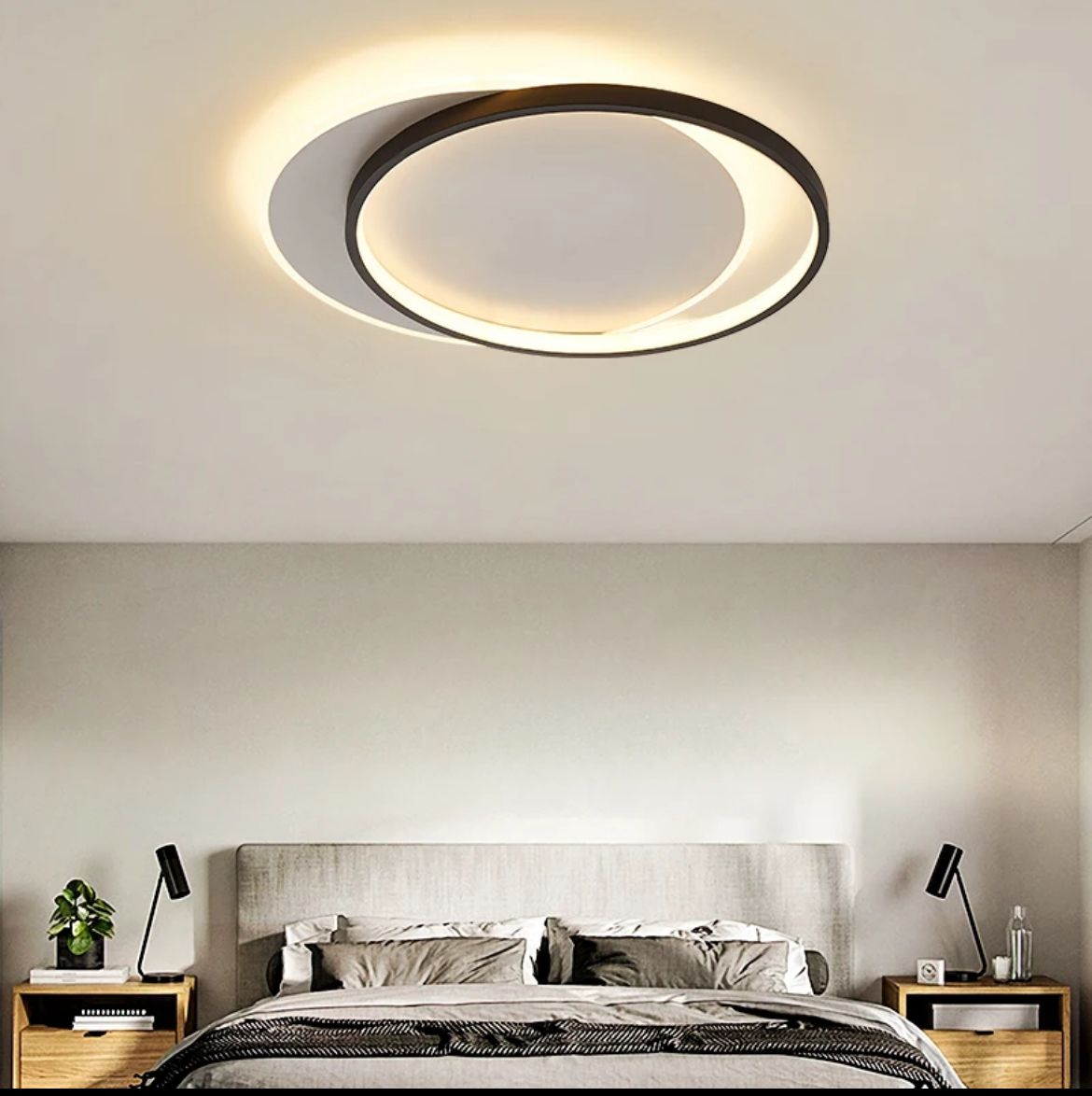 1. Design Moderno a Cerchi Sovrapposti: Plafoniera con due cerchi sovrapposti, realizzata in metallo e acrilico bianco e nero per un'eleganza senza tempo.