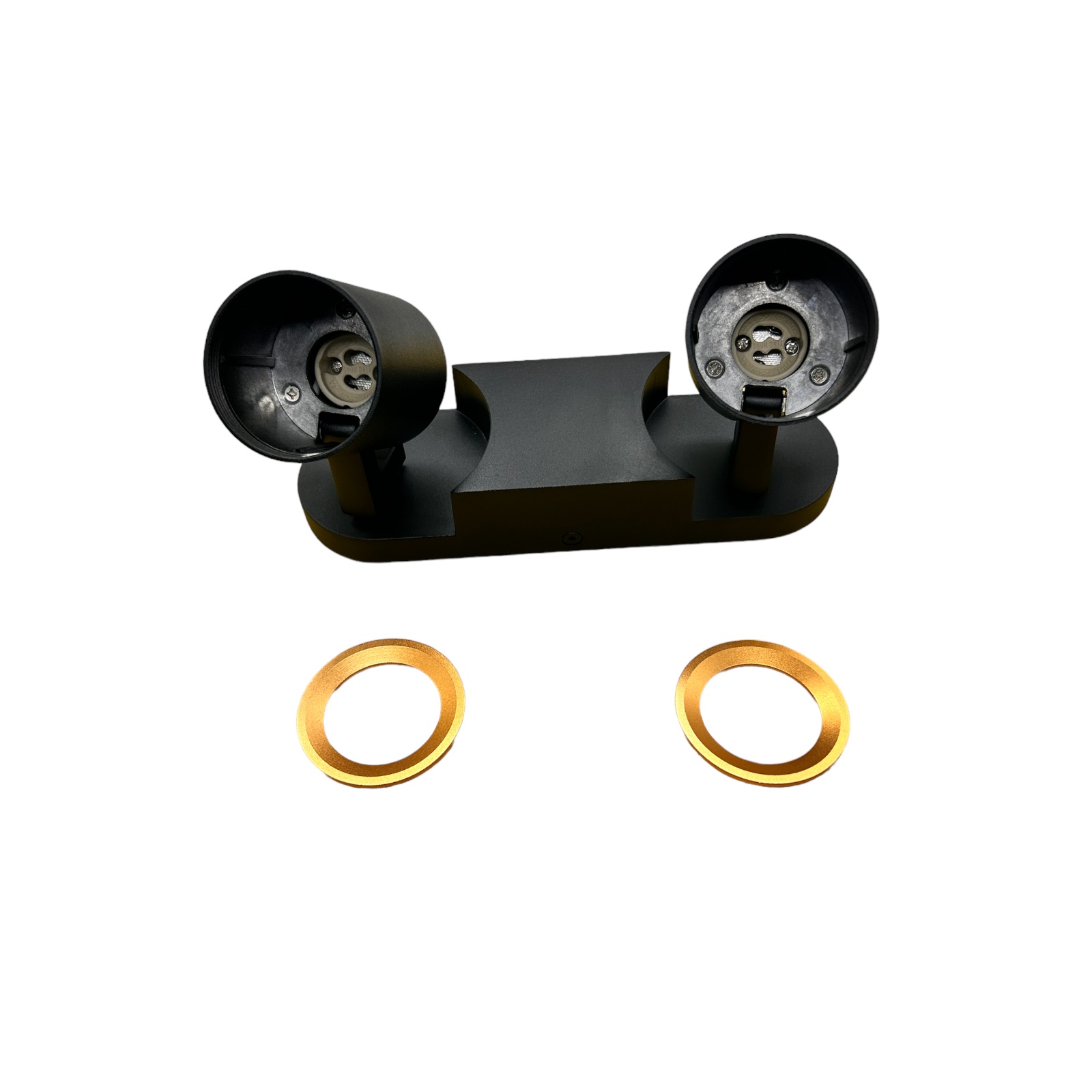 • Caratteristiche: Colore Nero e Oro,  2 diffusori e doppio Attacco GU10 con massima potenza supportata di 35W cada attacco, misure: 22x11x7 cm (vedi foto)