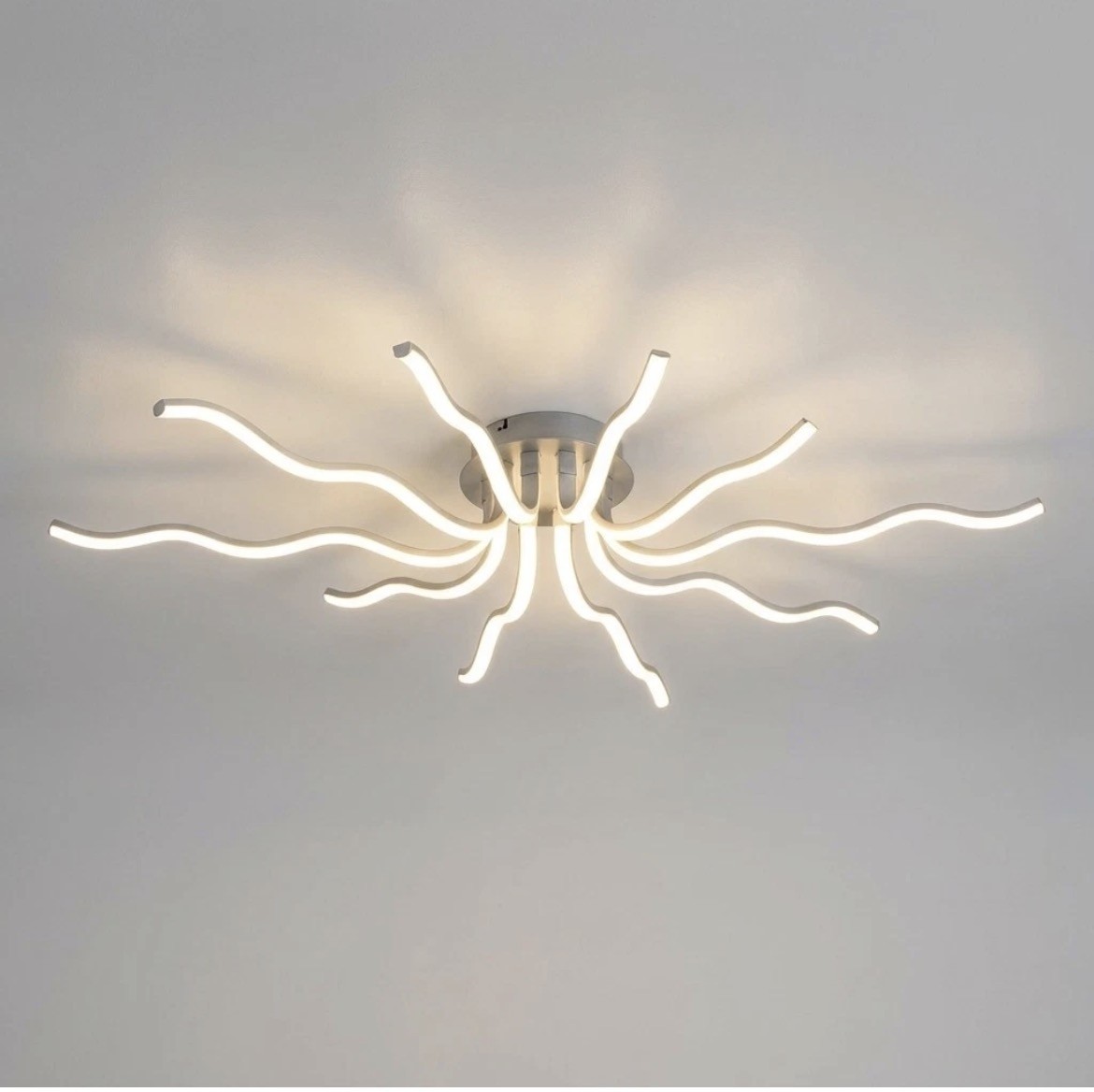 Plafoniera LED dal design moderno e originale, ispirato alla forma di un polipo, con bracci luminosi ondulati che creano un forte impatto visivo e valorizzano il soffitto con un effetto decorativo elegante.